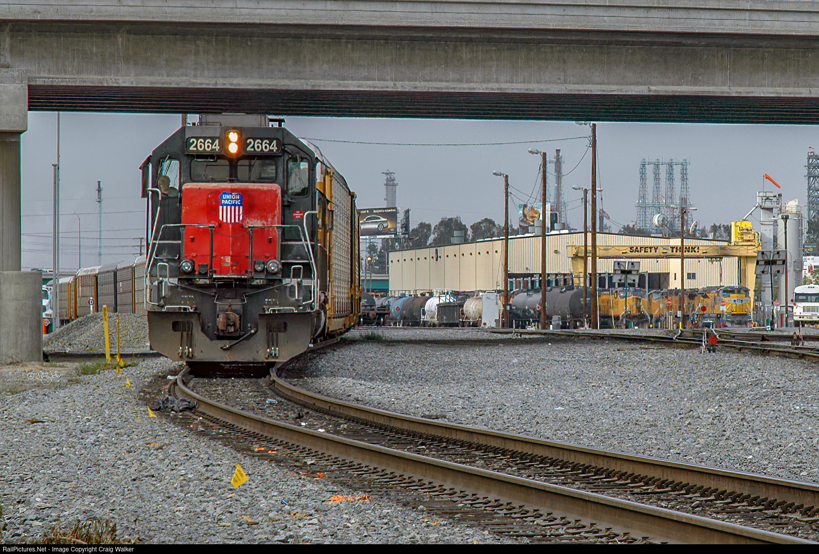 Pulling a string of autoracks along the Union Pacific's Dolores Industrial Lead is Union Pacific SD45 (now dubbed an SD40M-2) 2664, along with a Union Pacific SD40-2. UP 2664 was built by EMD in March 1969 as Southenr Pacific SD45 9020. SP would retire this diesel in 11/90, and in 4/90 sell it to National Railway Equipment Corporation (as NREX 9020). In 6/94 NREX would sell it to Morrison-Knudsen, rebuilt it into SP SD40M-2 8588. This diesel was renumbered UP 2664 on 12/13/01. (Carson, California – June 9, 2005)