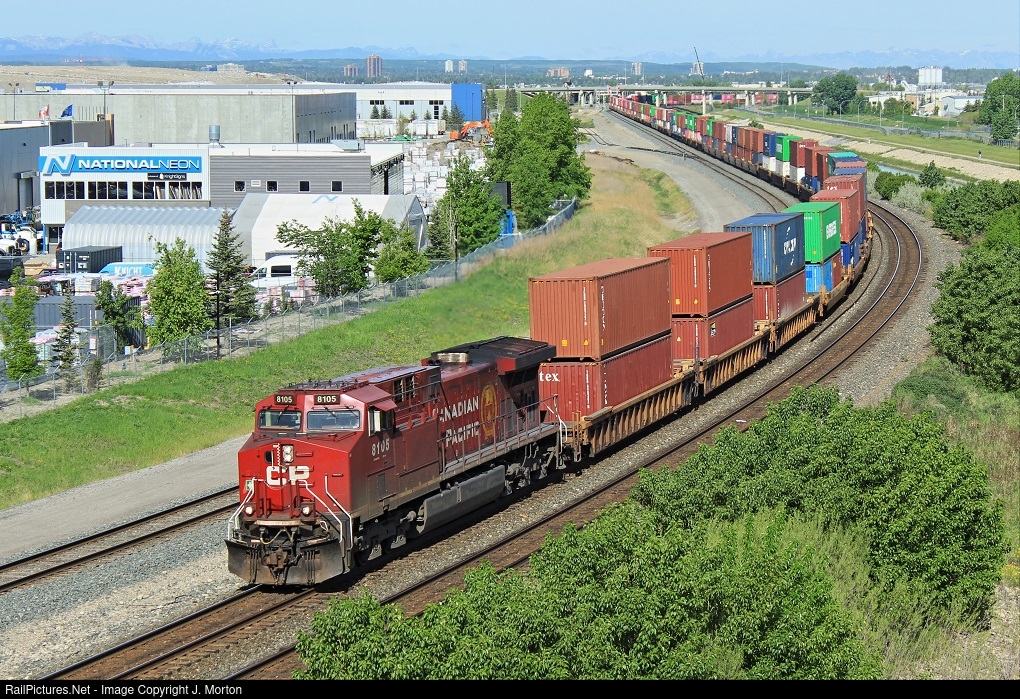 | CP 8105 leads train 114 east near the CPKC Shepard Intermodal yard in Calgary. In the distance you can see the Rocky Mountains, which are approximately 60 miles away. This train shed one of its locomotives back at Ogden. Once out of the mountains, eastbound trains will often do this. Less power is needed on the prairies. |