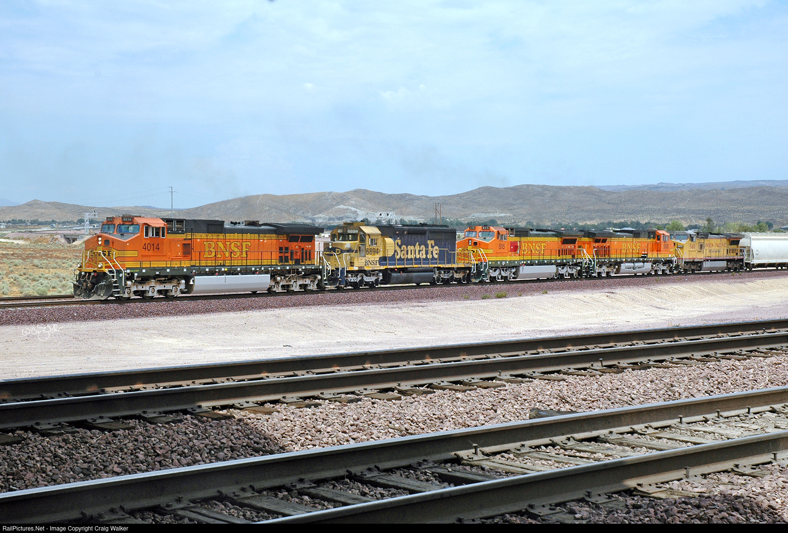 Pulling out of the BNSF Railway's Barstow Yard is a westbound freight, with BNSF Dash 9-44CW 4014, BNSF SD40-2 6894 (ex-ATSF 5166), BNSF Dash 8-40CW 815 (ex-ATSF 815), BNSF Dash 9044CW 5508 and Union Pacific Dash 8-41CW 9410 for power. (Barstow, California – July 23, 2005)