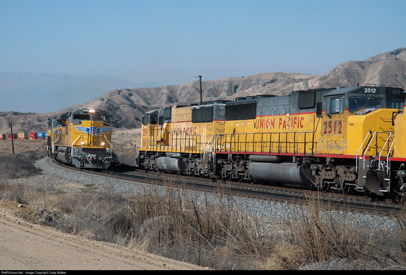 Union Pacific Long Beach CA to Englewood TX Intermodal train ILBEW 25 rounds the S-curve at milepost 554, near El Casco, with SD70ACe 8492 on the point, teamed with an SD70M, a second SD70ACe and another SD70M.