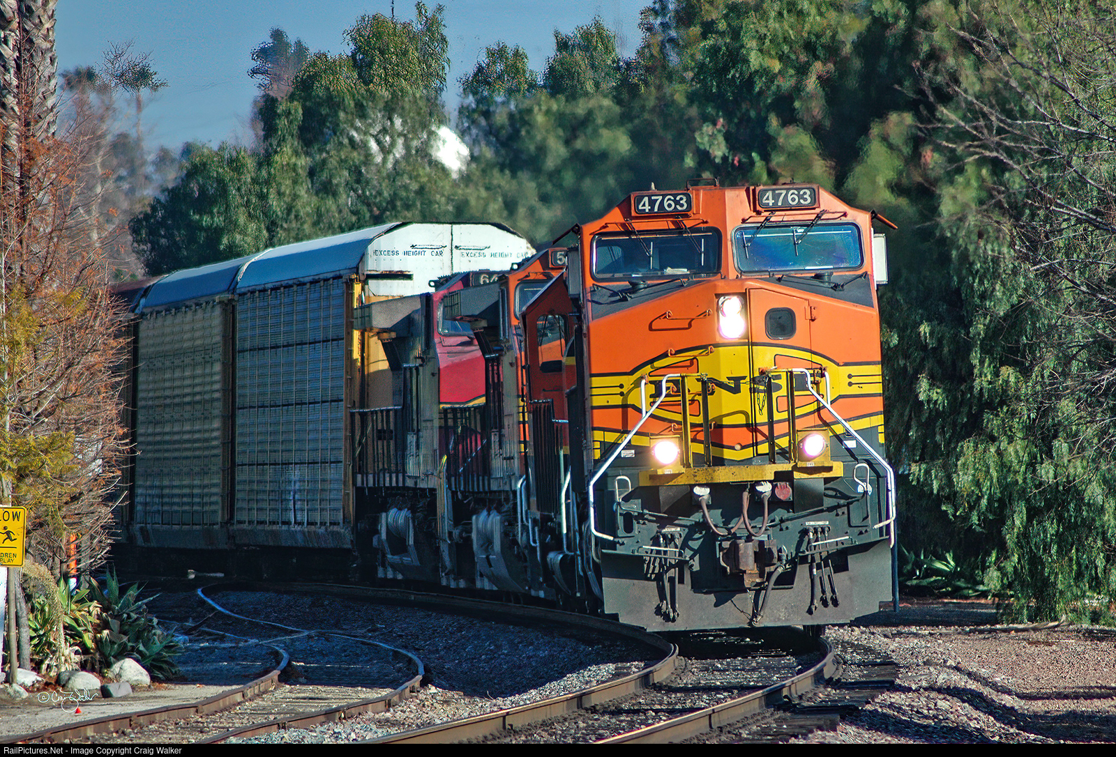BNSF Dash 9-44CW 4763 leads a Barstow to San Diego freight past the historic Santa Fe station (the white dome above the autoracks, hidden in all the vegetation) in San Juan Capistrano, California, on February 3, 2007. The consist is Dash 9-44CW 4763, GP35 2551 (ex-ATSF 2851, ex-ATSF 3351, née-ATSF 1351), Dash 9-44CW 5052 and Dash 9-44CW 642 (ex-ATSF 642), with Dash 9-44CW 4188 bringing up the rear (DPU).
