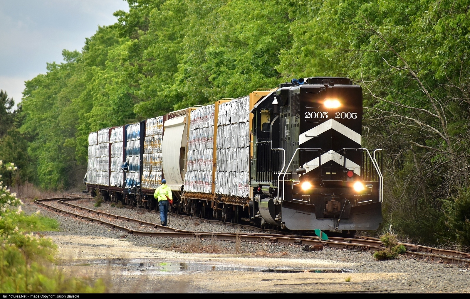 | At the Cross St. Runaround - The JB-2 was a fun train to chase, especially on a cloudy day. Here at the end of the line the train has completed its runaround. The conductor is now taking the end-of-train marker to the back end of the train. Special thanks to Bracdude181 from