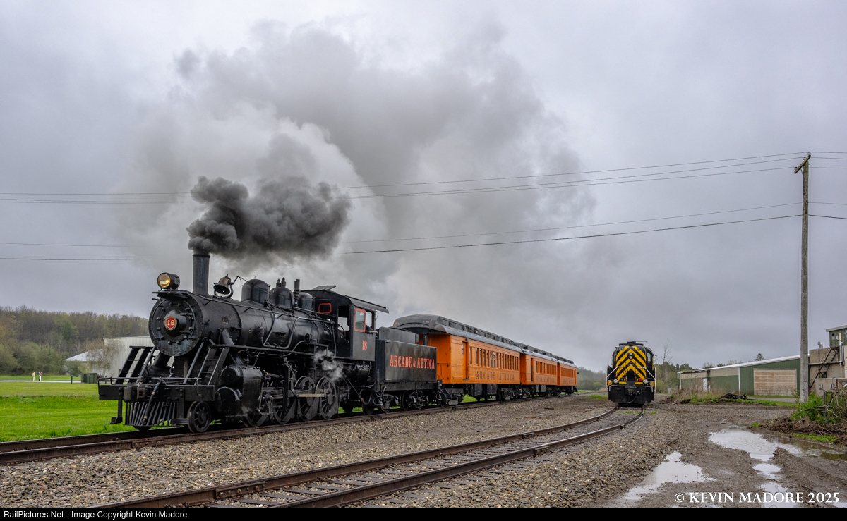 This image was captured in May of 2025 during a photo shoot on New York's Arcade & Attica Railroad, organized by Dynamo Productions. The Arcade & Attica is currently New York State's only steam tourist railroad and has been offering steam excursions off and on since the early 1960s. With relatives living in the upstate City of Watertown in the 60s, I vividly recall traveling with my family in the Empire State as a little kid and seeing advertising brochures for this railroad at many tourist spots. Unfortunately, our travels never took us far enough west to visit this operation. The Dynamo photo shoot was my first opportunity to see this railroad, literally 60 years later. Fortunately, the line is still in business, still operating as a local freight carrier and still running weekend tourist excursions with steam locomotives. Interestingly, they are not only running the same equipment, but are also featuring the same, very unique, orange and black livery that I saw as a kid on those tourist flyers.