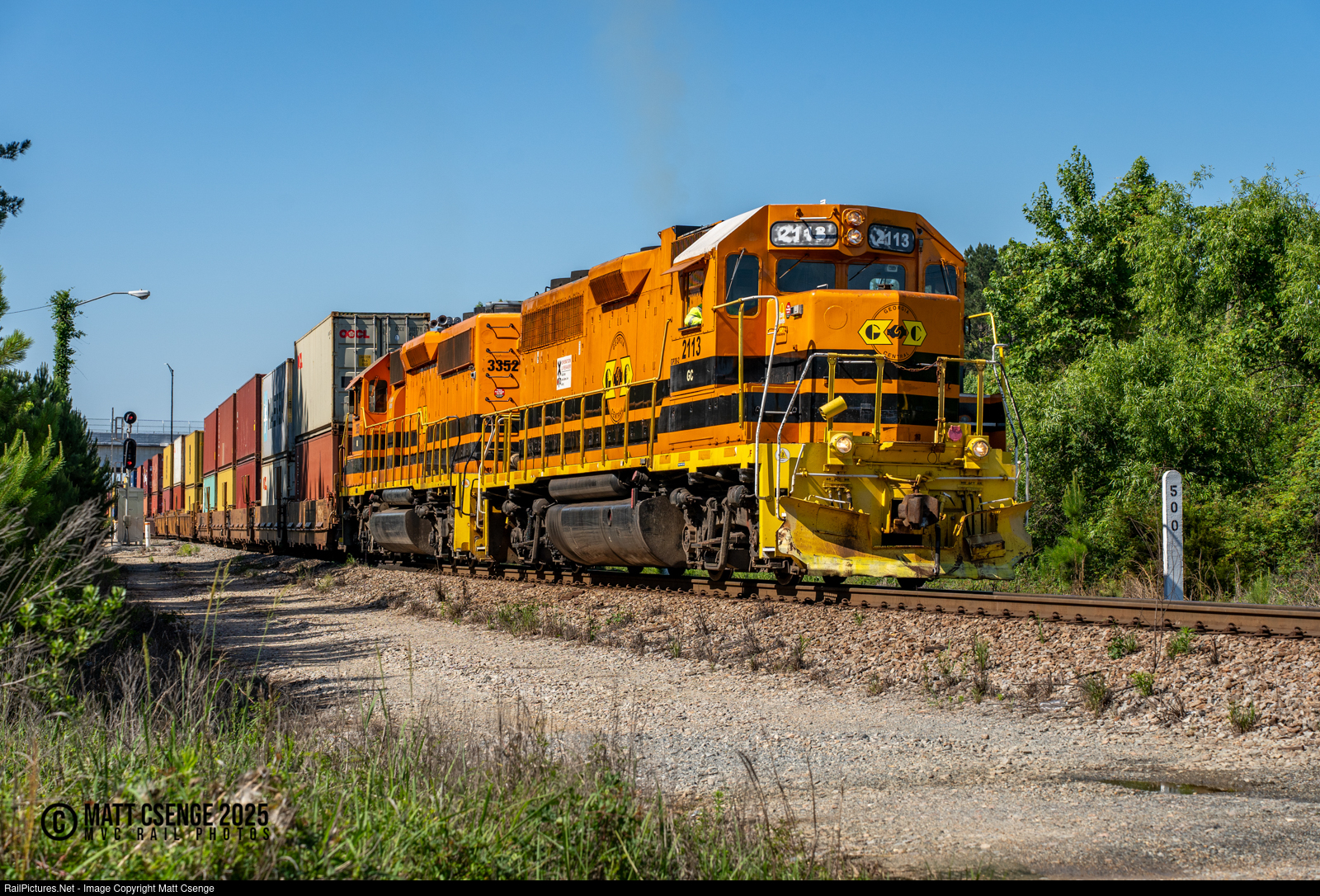 Georgia Central Railroad (GC) GP38-2 no. 2113 is seen pulling a double-stack consist out of CSX Savannah Yard through Alabama Junction, passing milepost 500 of the former Seaboard Air Line Railroad (SAL). This area was once part of the SAL mainline from Richmond Main Street Station in Richmond, VA to Seddon Island (now named Harbor Island) in Tampa, FL, with the mileposts starting at the northern terminal.