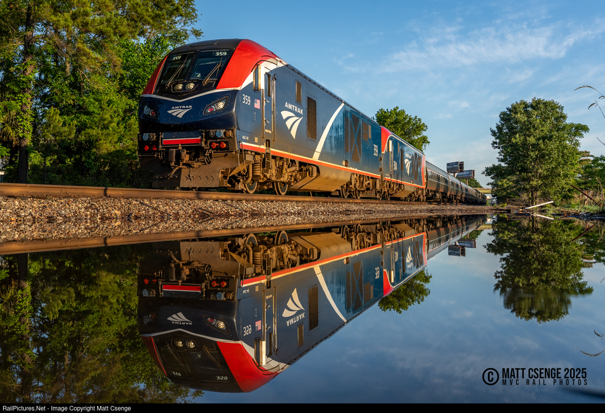 The sun has just barely risen above the lush southern landscape as Amtrak ALC-42 no. 359 leads train 97(12), the southbound Silver Meteor through Savannah, GA en-route to Miami. A convenient pool of water, collected from the heavy rainstorms over the days prior, doubles the number of Siemens Charger locomotives that can be seen!