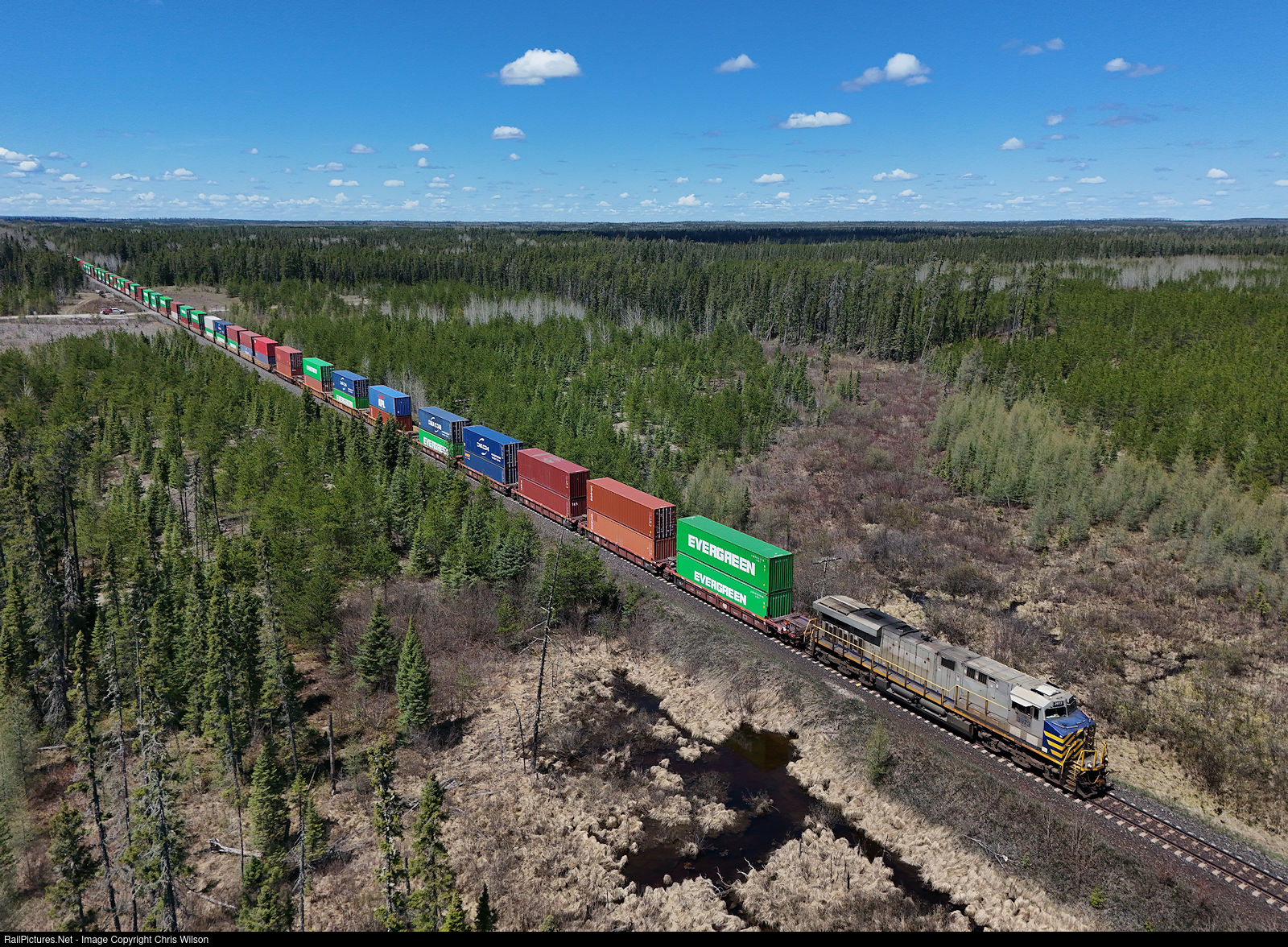 Vancouver Thornton, BC to Brampton Intermodal, ON stacks roll east along the Caramat Sub with a ex CREX unit upfront. CN 3148 is providing distributed power 80 platforms back on this 132 platform 8464ft stack train.