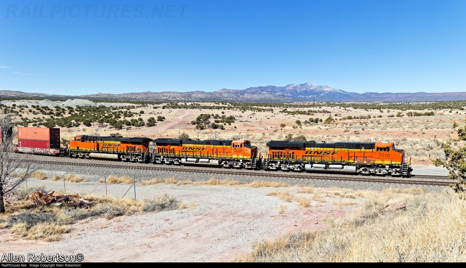| BNSF 7110, 6560, & 6507 lug an eastbound stack train out of Abo canyon. |