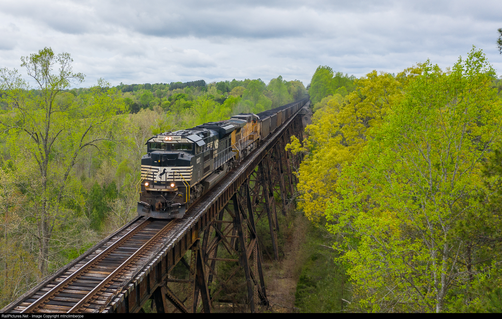 | Loaded Norfolk Southern cola train 820 charges east on the Altavista District behind an SD70ACe and a UP AC4400 as the train heads towards the Lamberts Point export docks. The train is rolling over the trestle in Phenix, Virginia that spans the valley of Terrys Creek. |