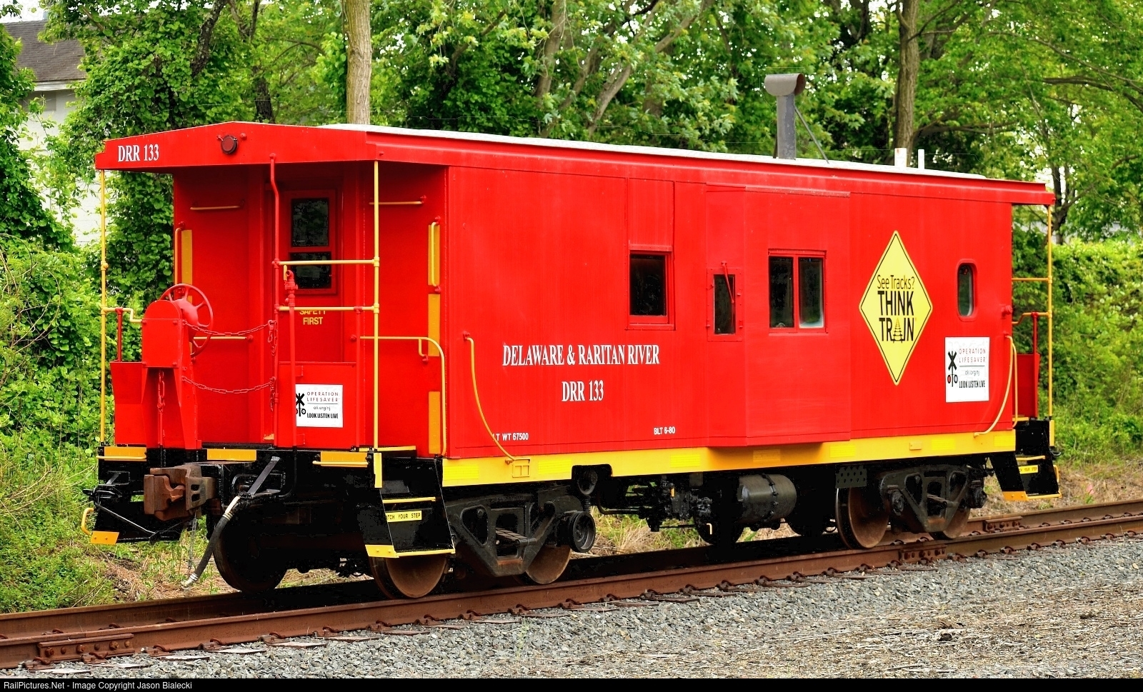 | See Tracks? Think Caboose - The DRR has a beautifully maintained bay window caboose. It is seen parked on the north leg of the Farmingdale wye (recently completed in 2023) near the Southard Ave. grade crossing. This caboose espouses "Safety First" and promotes Operation Lifesaver. |