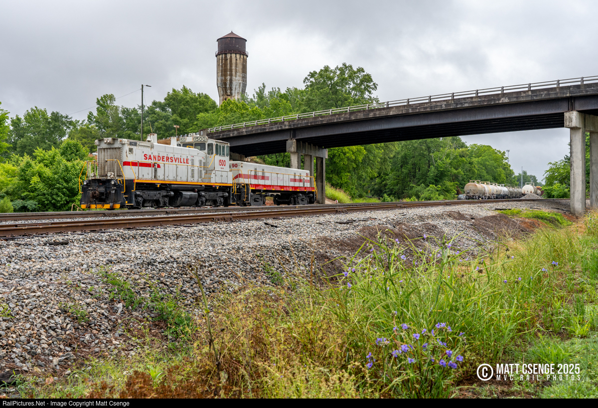 Sandersville Railroad (SAN) SW1500 no. 1500 and booster 90 are seen running light under W Adams St in Tennille, GA as they make their way back up the the railroad's yard outside of town. |