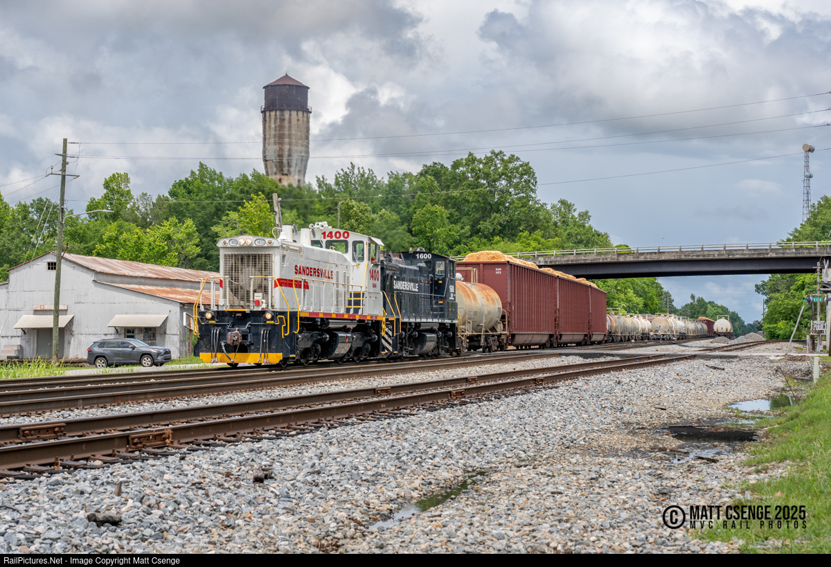 Black and Gray. Sandersville Railroad SW1500 no. 1400 and MP15DC no. 1600 are seen hauling a train towards the interchange yard in Tennille, GA. The latter locomotive is the newest to the railroad's fleet, having been purchased from Norfolk Southern in 2016. Its heritage is apparent from the black paint scheme, though upd ated with an adaptation of the Sandersville paint scheme.