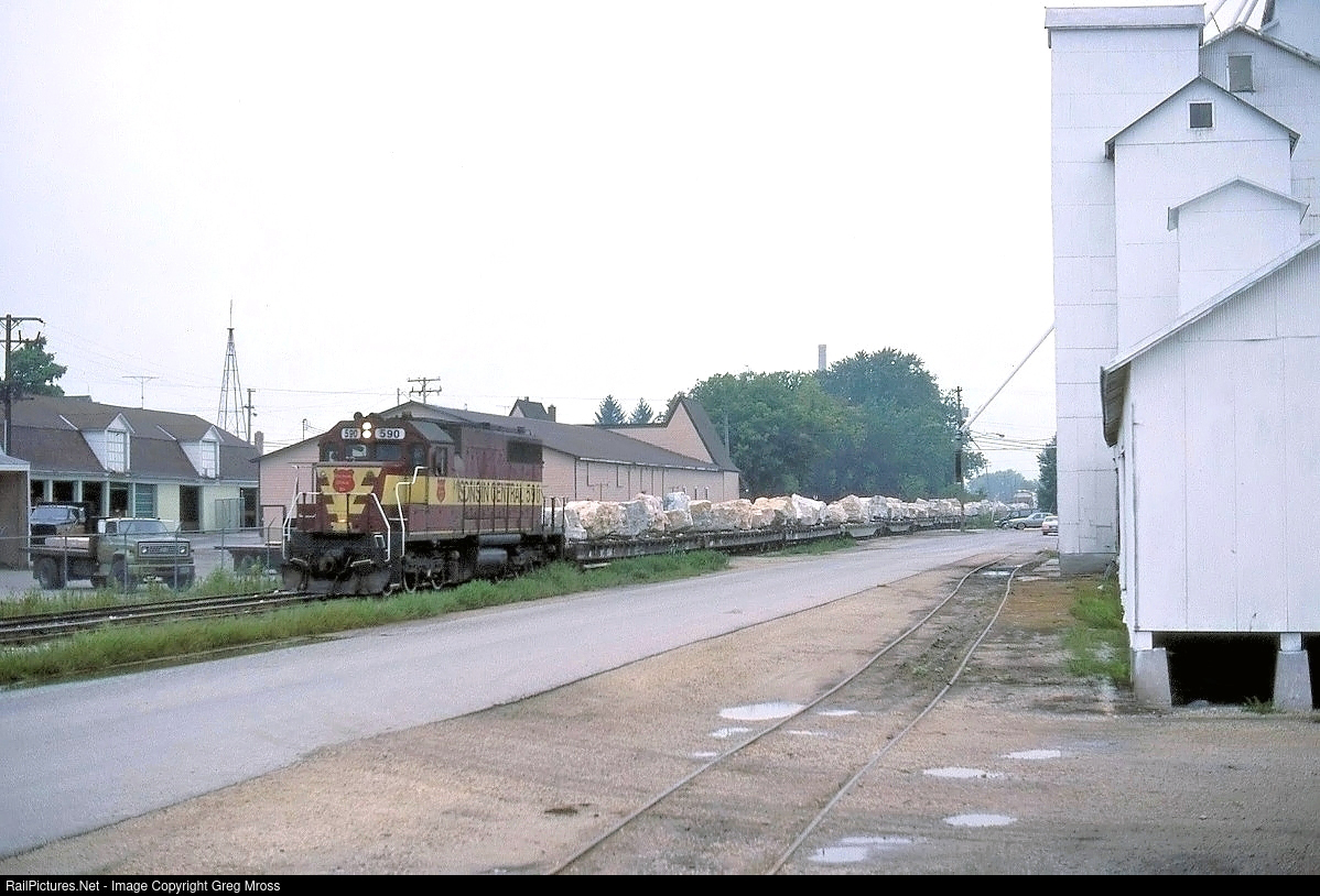 WC 590, a rare SDL39, creeps thru Valders, WI on a gloomy day in September of 1989. The limestone blocks on the head end will be dumped in Lake Michigan to construct a breakwall in Manitowoc. The blocks are not secured in any way and the train is limited to 10 mph.