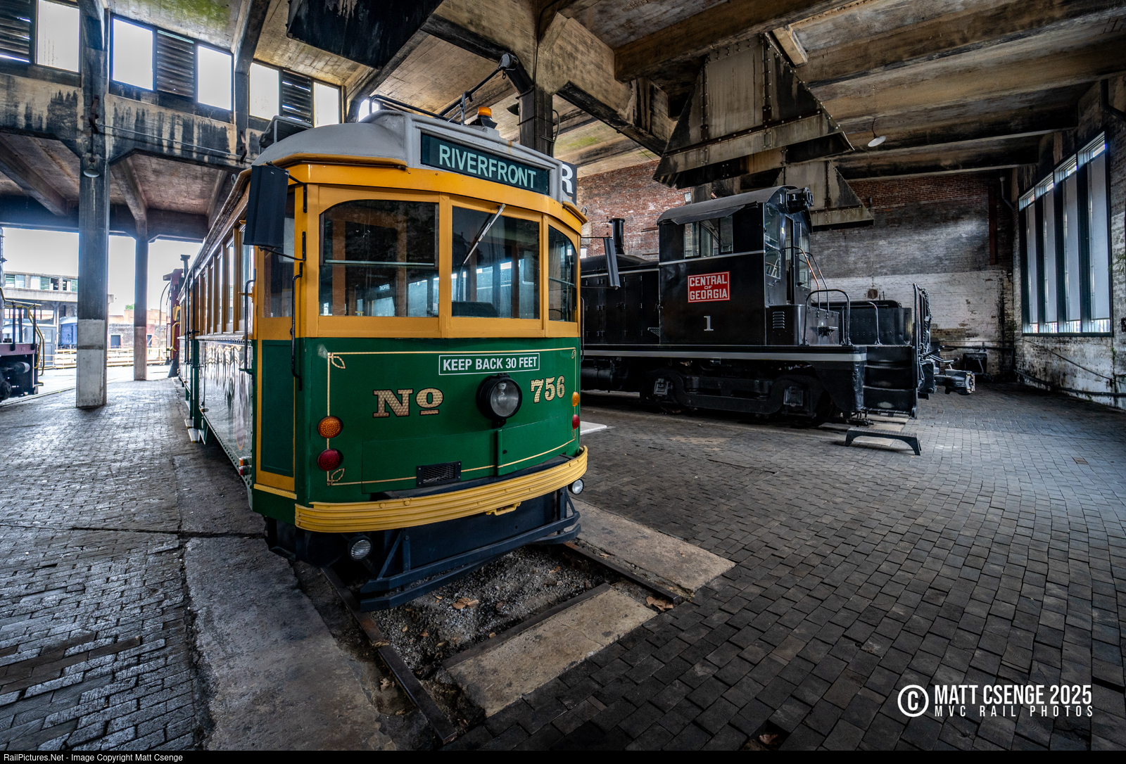 The roundhouse at the Georgia State Railroad Museum is filled with a variety of preserved equipment. Here we see two of the many pieces: Central of Georgia (CG) SW1 no. 1 and streetcar 756.