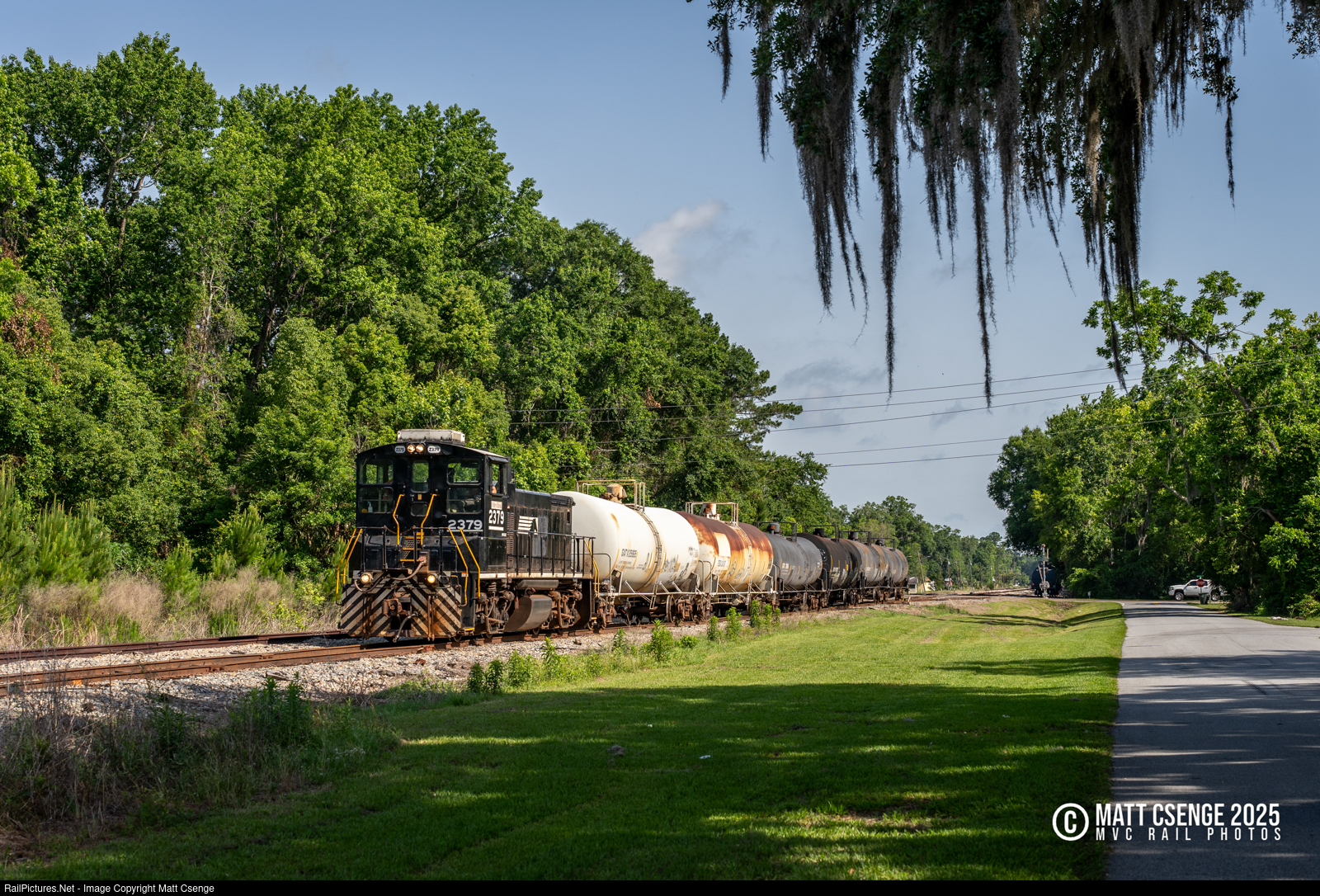 Spanish moss dangles from the trees, swaying in the breeze as the St. Marys Railroad (SM) departs from the interchange yard in Kingsland, headed back to their namesake Georgia town with MP15DC no. 2379 leading the way. The 11-mile class III railroad operates in the towns of St. Marys and Kingsland, Georgia, connecting to the First Coast Railroad in the latter.