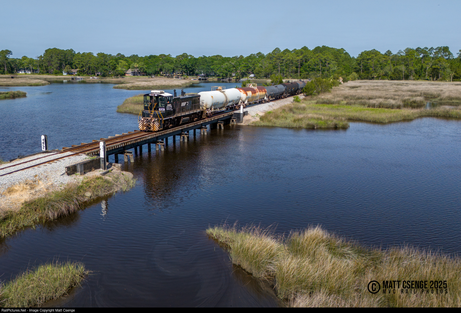 St Mary's Railroad (SM) MP15DC no. 2379 is seen crossing the St. Marys River in St Mary's, GA.