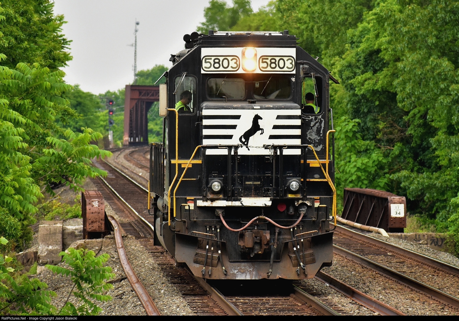 | A Main Line Runaround - NS 5803 is pushing east on the westbound track toward CP-Aldene in the distance. It left its short train of boxcars a few hundred yards behind here on the main line adjacent to the Anacapri siding. Once at CP-Aldene the locomotive will head west on the eastbound track all the way to CP-Potter in Edison (Inman Ave). From CP-Potter the locomotive will head east again on the westbound track to meet the opposite end of its train, thus completing a runaround. It will then switch out boxcars at Anacapri before returning west to Manville Yard. |