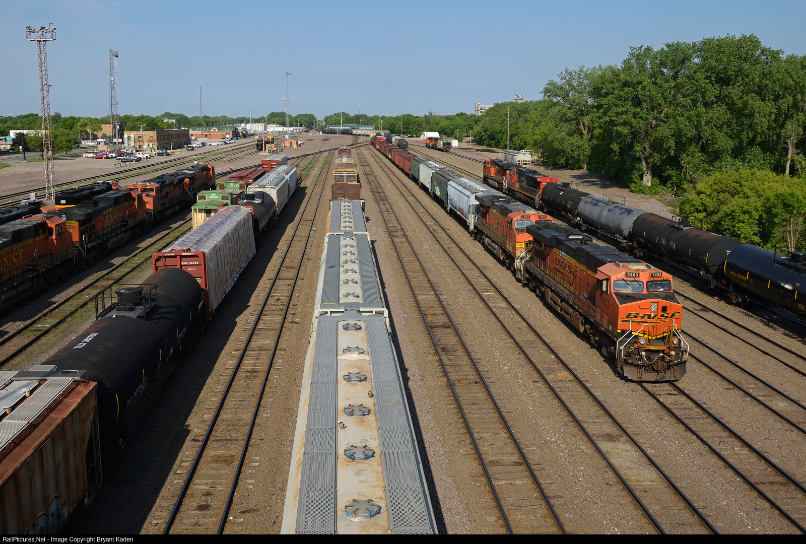 Even though it's a holiday for most people, Memorial Day morning still finds quite a bit of activity happening at BNSF's yard in Willmar, MN. Things to see include some older EMD power on a local freight, a mix of GE and EMD power on another manifest, some snowfighting equipment that shouldn't be needed for a few months, a couple of former BN cabooses, the west end yard power with a single former BN hopper car, and another manifest with a CN visitor. That train will depart soon after the BNSF 7463 finishes yarding their train off of the Marshall Subdivision. The former Great Northern depot and yard office can also be seen in the upper left.