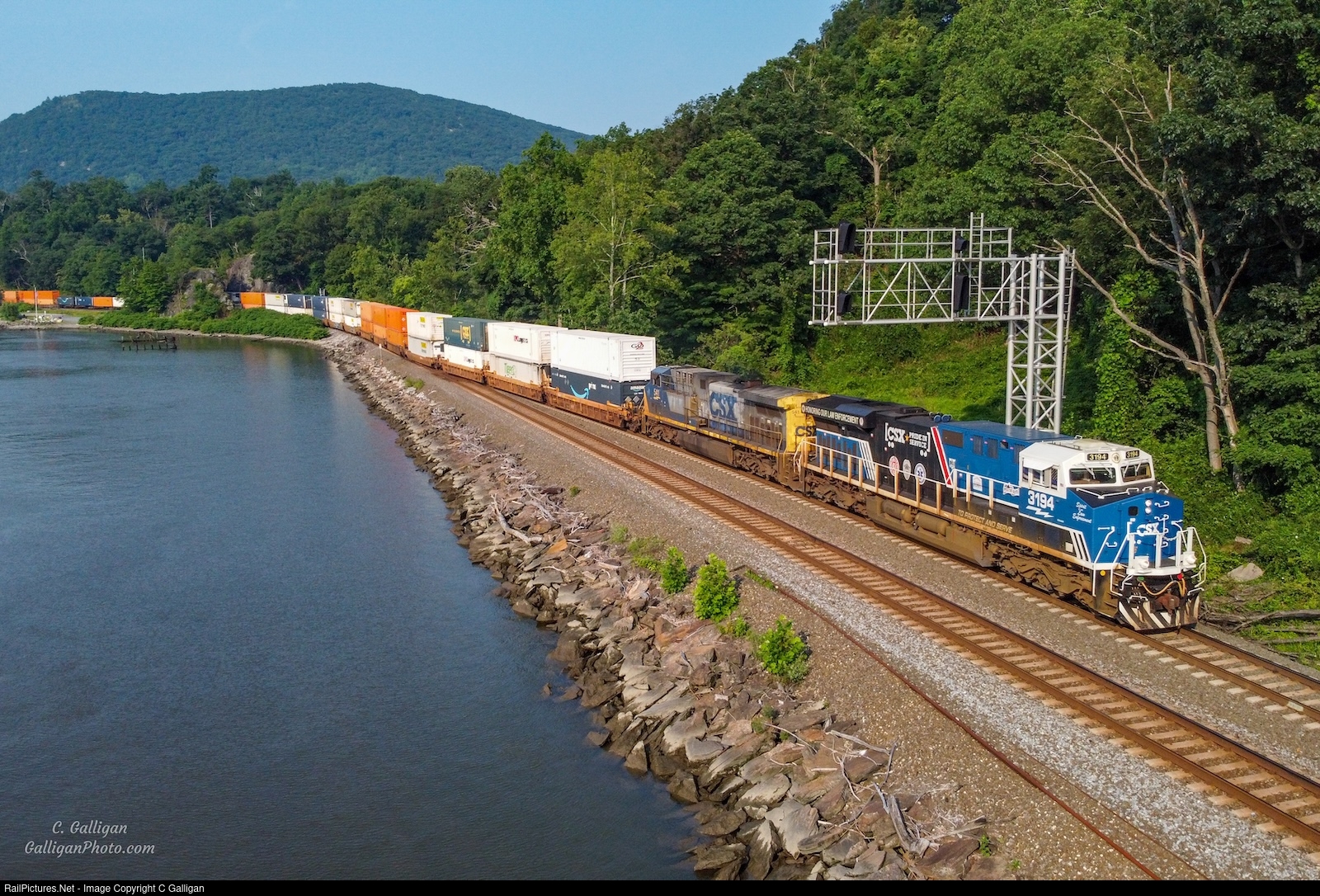 | CSXT Intermodal Train Q00316 rides the shores of the Hudson River passing the signal bridge at CP 43 with CSXT3194, dedicated to honor men and women of law enforcement. |