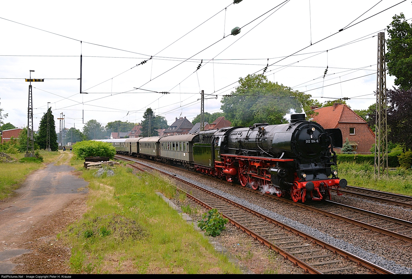 | Exactly 50 years after the era of steam-powered express trains in western Germany ended, 012 104-6 of Faszination Dampf is running a chartered train on the classic main line from Rheine to Norddeich-Mole. The train can be seen here passing the town Aschendorf on its way to the North Sea. |