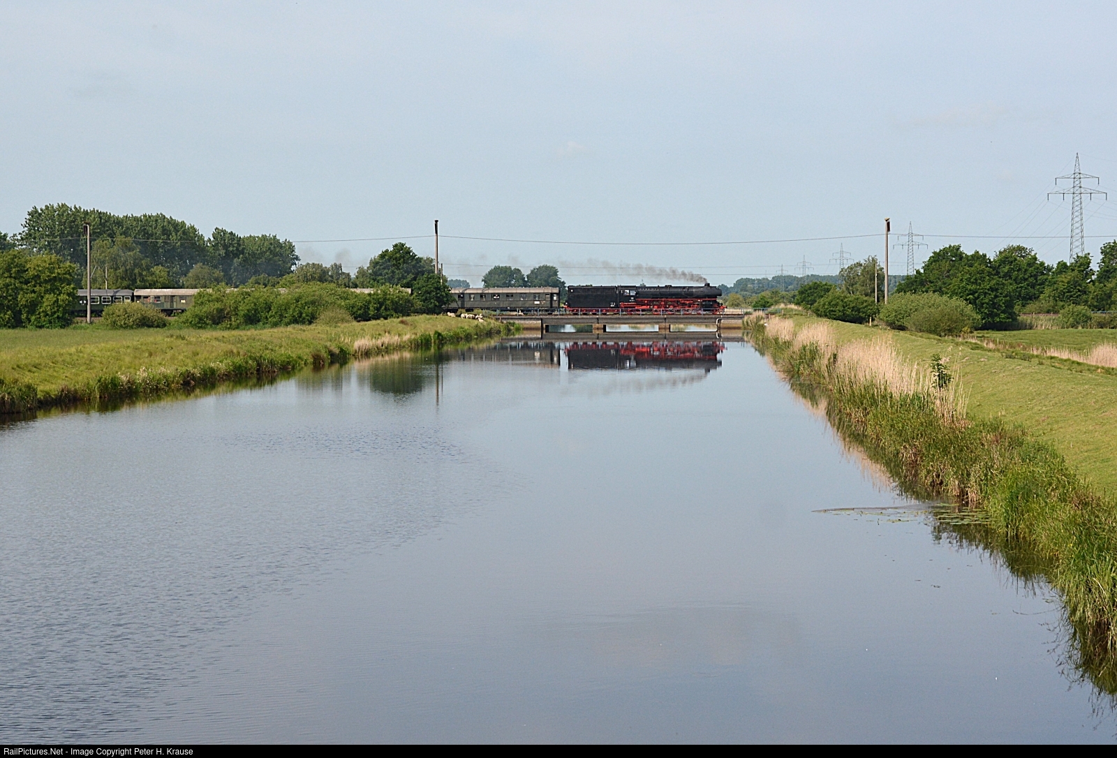 Commemorating the 50th anniversary of the last steam-powered express-trains in western Germany, 012 104-6 was running on the "Emsbahn" line again. South of Neermoor the train is reflected in the Sauteler channel on its way to Norddeich-Mole at the North Sea.