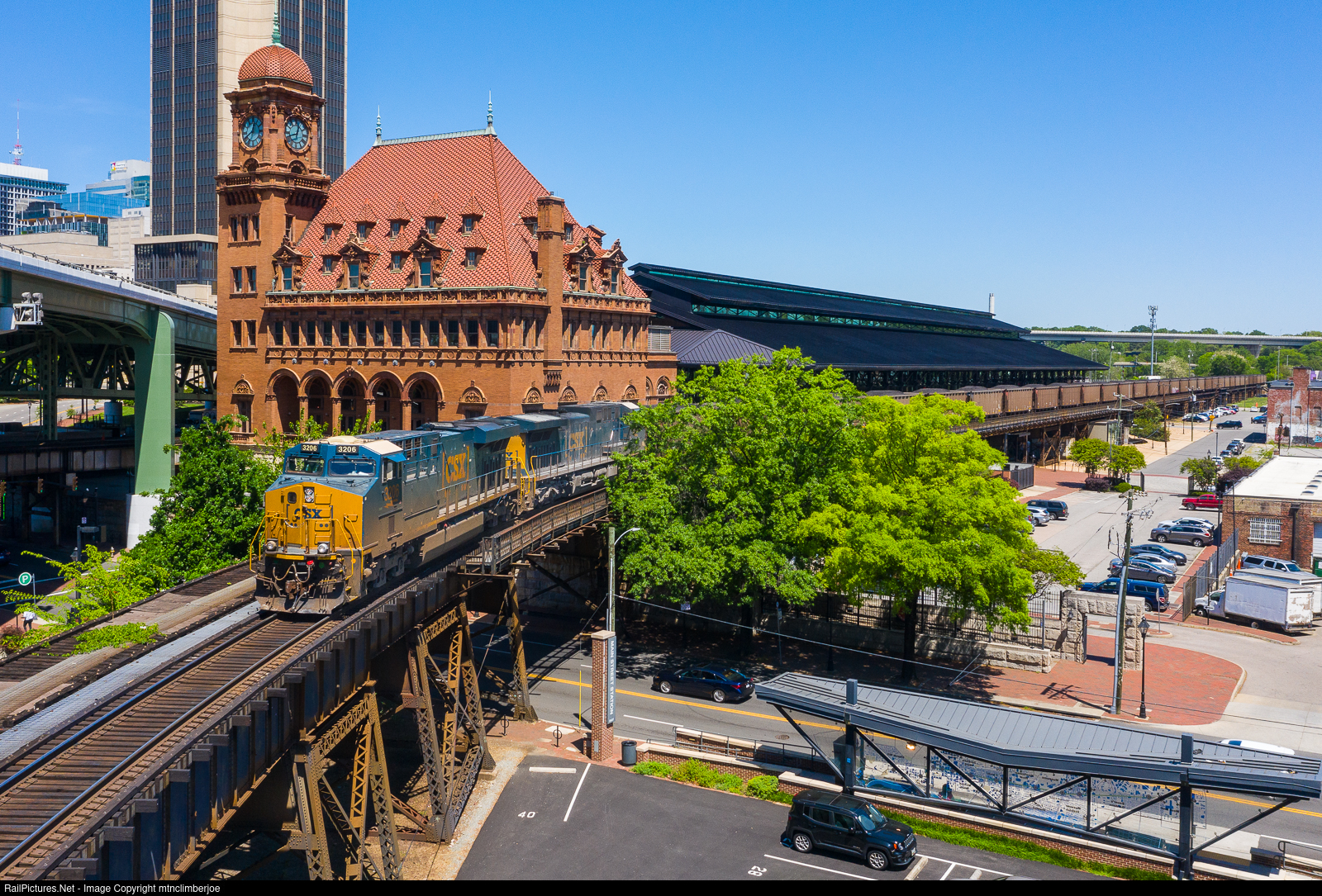 CSX loaded coal train C317 makes a shove move out of Fulton Yard, being pulled by the Y110 yard crew, in order to make the turn to head south from Richmond, Virginia after arriving from the west. The train is passing by the Main Street Station and Trainshed, built in 1901 by the Seaboard Air Line and C&O as a joint station.