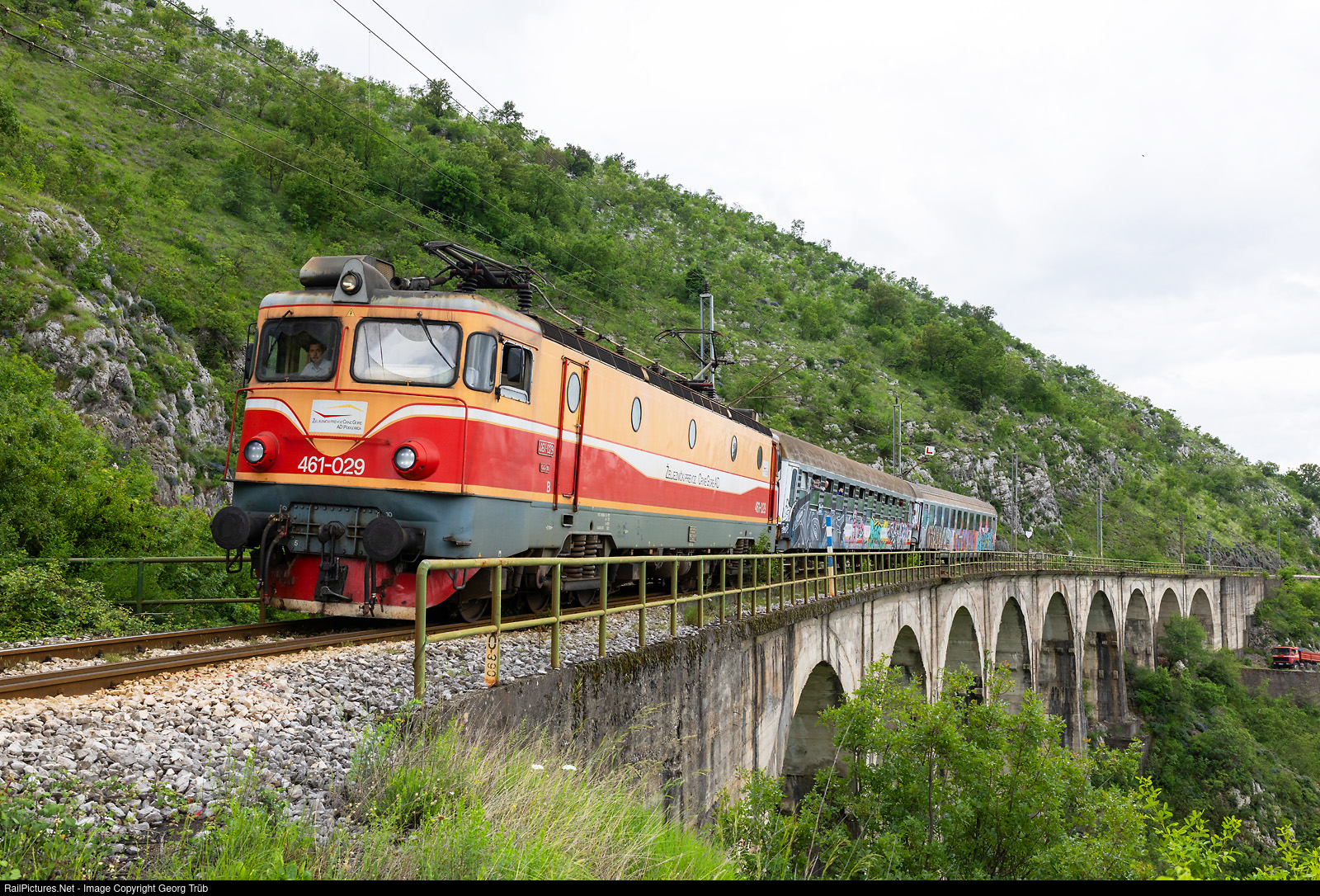The Belgrade–Bar railway is a 476.59 km (296.14 mi) long electrified main line connecting the Serbian capital of Belgrade with the town of Bar, a major seaport in Montenegro. Completed in 1976, which connects Belgrade with the Mediterranean port of Bar. It was built by the Yugoslav State Railways (JŽ) in 25 years of construction and is now operated by its successor companies Železnice Srbije (ŽS), Željeznice Republike Srpske (ŽRS) and Željezni?ka Infrastruktura Crne Gore (ŽICG). The mountain railway crosses three mountain ranges in the Dinaric Mountains and has its highest point at 1,032 m (3,386 ft) south of this, the maximum gradient of the route is 25 ‰, north of it 17 ‰. The route in the difficult terrain required 254 tunnels and over 243 bridges. The route is considered one of the most difficult in Europe. For SERVRAIL from Switzerland, a charter train circulated from Bar to Bijelo Polje (158 kilometer) and some photo stops were organized by guide Dragan. Here the train with electrolocomotiv 461 # 029 of the ZPCG Railways Montenegro is crossing a viaduct near the Bioce station on the spectacular ramp from Podgorica up to the Mala Rijeka viaduct.