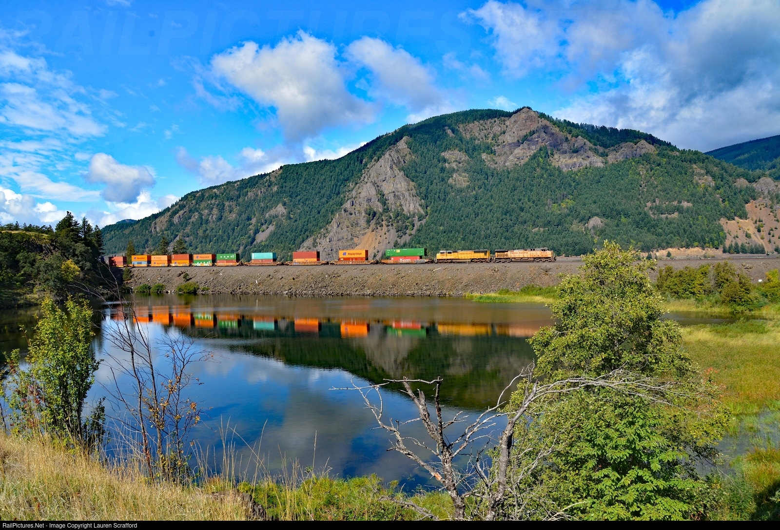 Union Pacific, UP 5704 E/B Intermodal crossing the fill at Viento, Oregon on September 28, 2019 with UP 4588 and 2 midtrain DPU's. Viento is along the Columbia River on the Portland Subdivision of the Union Pacific.