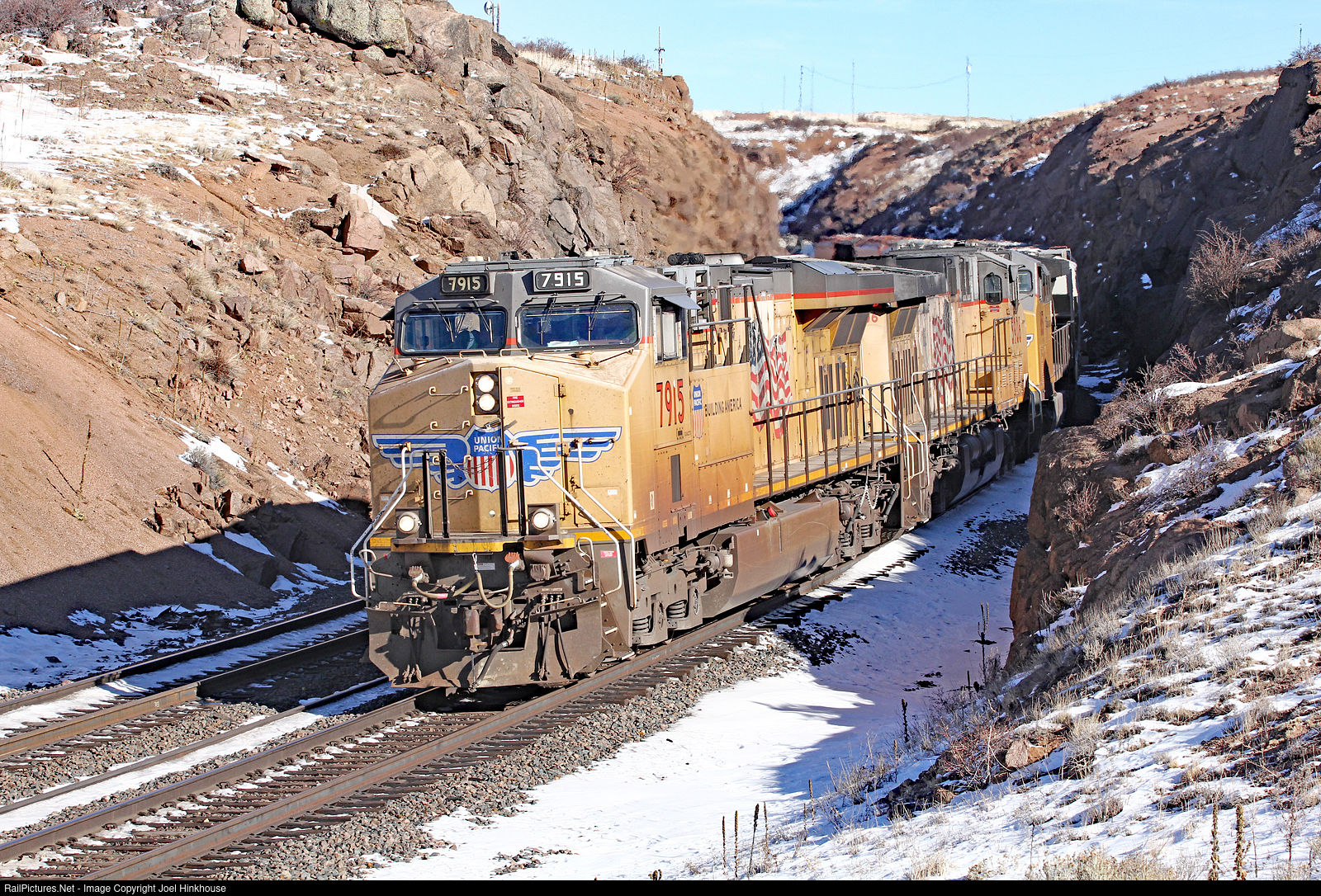 | Emerging from the cut after exiting the Hermosa Tunnels, UP 7915 will lead this train on to the old main on the approach to Laramie. |