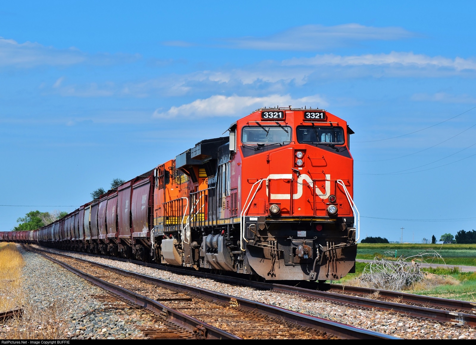 | Canadian National #3321 (AC44C6M) is tied down at Hillrose, Colorado as it waits for a relief crew to run to Denver. |
