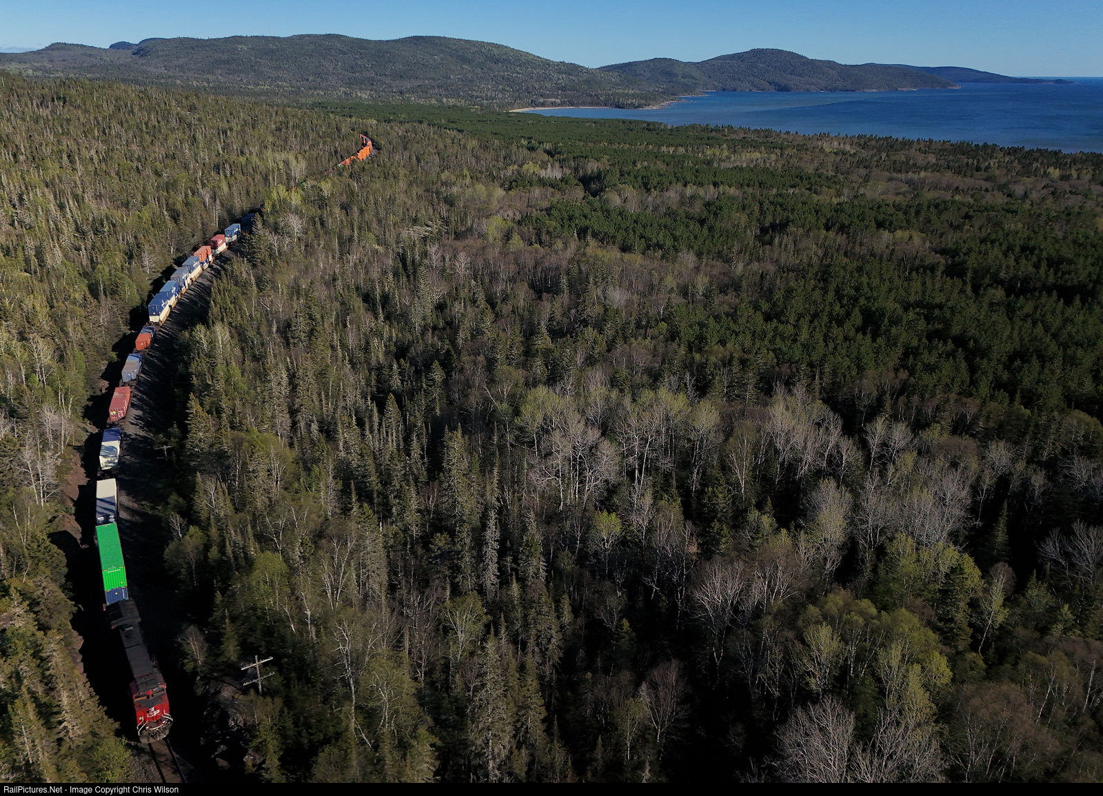 CP AC4400CWM 8038 is in eighth notch shoving 112's train up Neys Hill along the shores of Lake Superior.