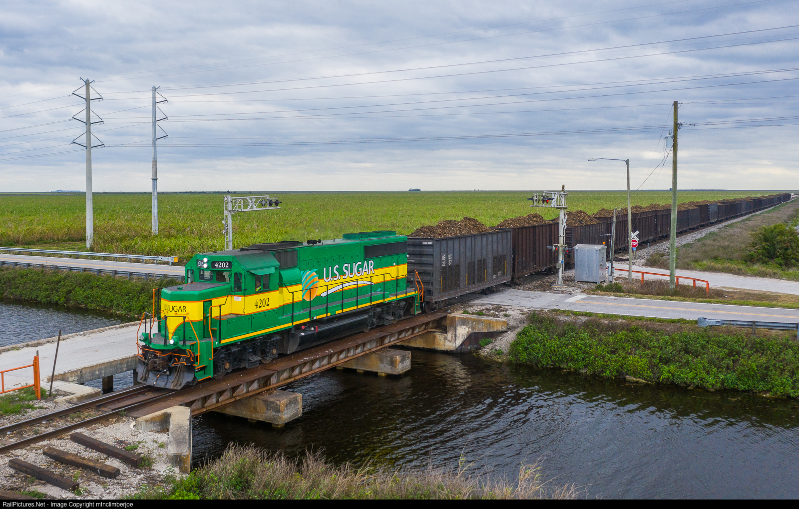 | With a train load of freshly harvested sugar cane, a US Sugar Corp. Railroad Bryant Turn heads towards the mill in Clewiston as it rolls north through Florida and crosses over Rogers Road and one of the many irrigation canals that crisscrosses the landscape. The GP40-2 powering the train is wearing the latest USSC paint scheme that is now being applied to the fleet of locomotives. |