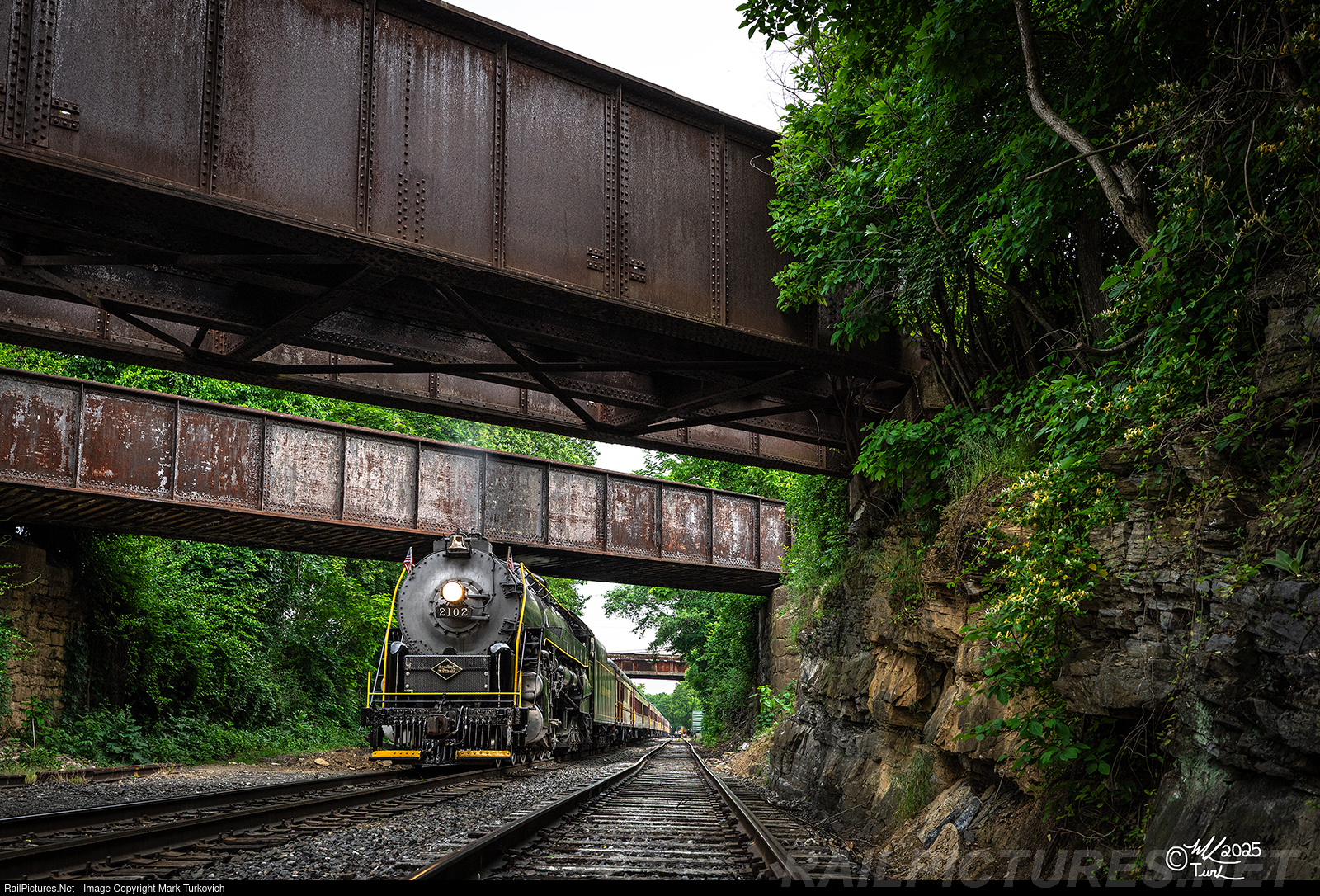 Reading 2102 rests under the former Reading Company Schuylkill & Lehigh Branch and Pennsylvania Railroad Schuylkill Division bridges at Reading Outer Station on a cloudy May evening.