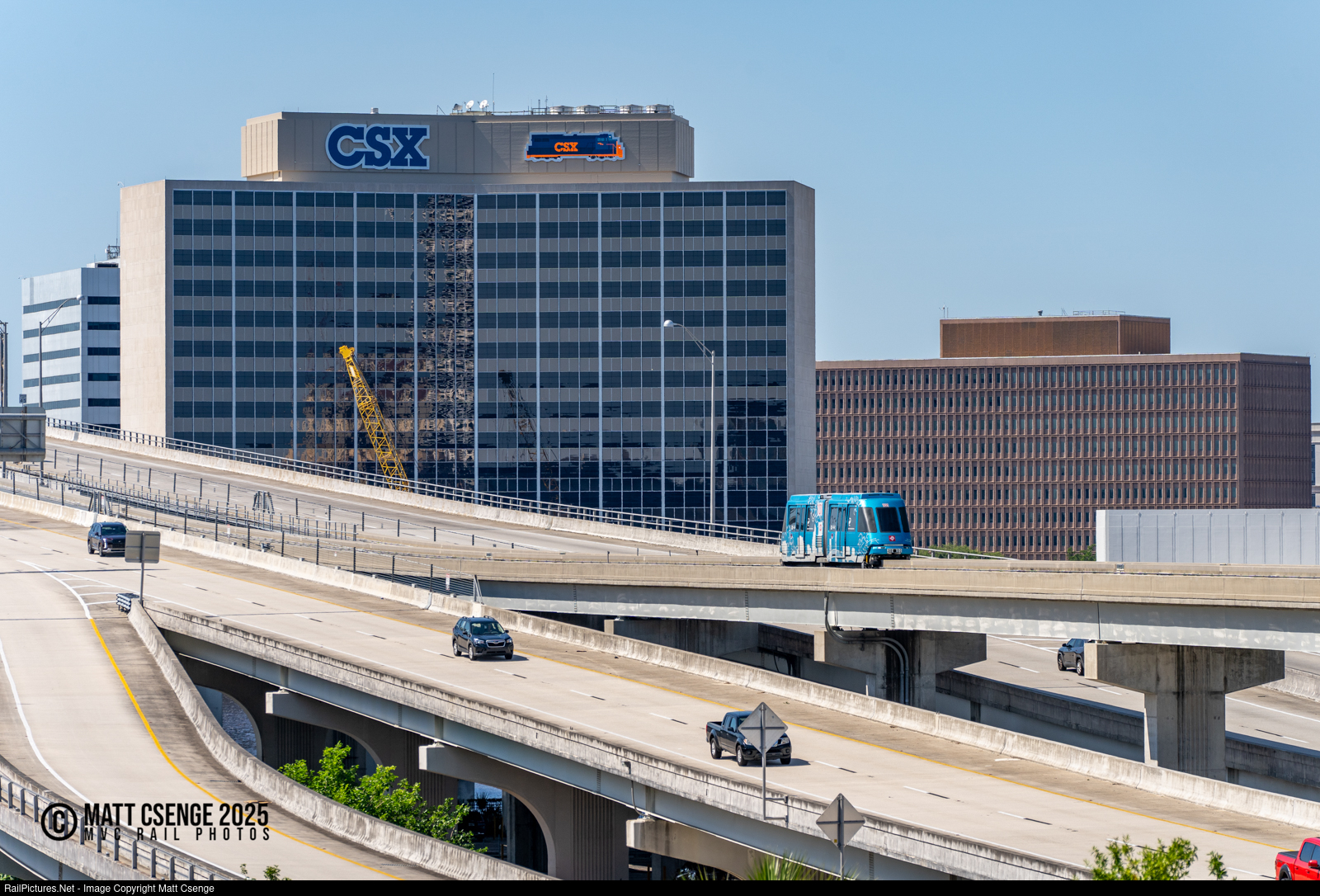 Jacksonville Transportation Authority (JTA) Skyway train 101 is seen crossing the Acosta Bridge over the St John's River. Looming large in the background is the headquarters of CSX Transportation, one of the Class I freight railroads that operates on this side of the Mississippi River. |