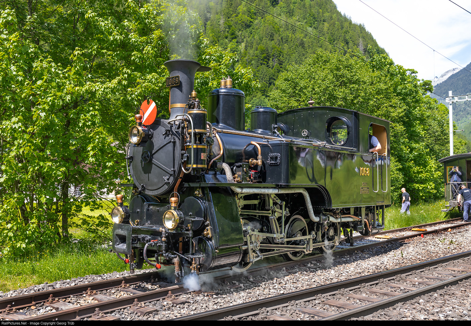 | Cogwheel steamlocomotive HG 3/3 # 1068 of the Brünig Dampfbahn (BDB) pulled train 2249 from Interlaken Ost via Zweilütschinen to Grindelwald over the tracks of the Berner Oberland Bahn (BOB). The train is now back in Schwendi bei Grindelwald and the locomotive will go around the cars, which is not possible in Grindelwald. The 0-6-0 T was built in 1926 by SLM Winterthur for the 1 meter gauge Brünig line of the SBB. Withdrawn in 1965 and exhibited in Meiringen between 1966 and 2000. Operational again since 2022. |