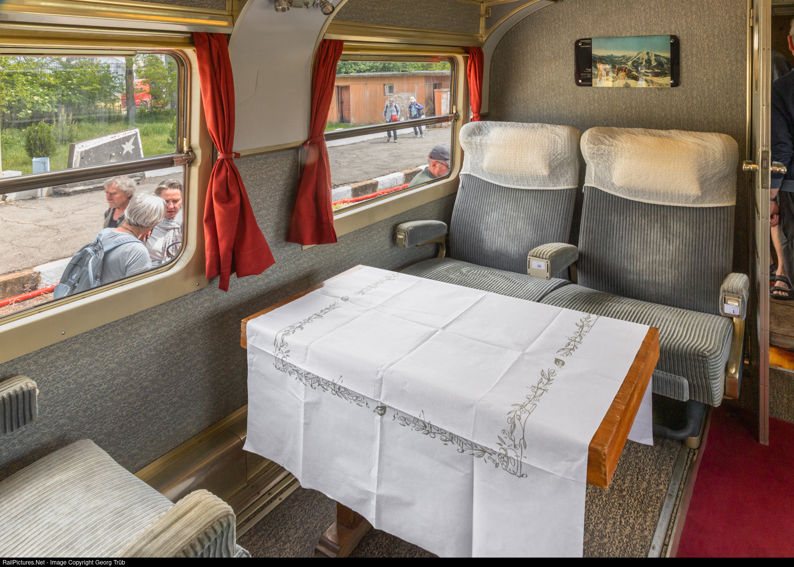 View of the first-class compartment of BDZ diesel railcar 19001.7 in Kostinbrod. The compartment has a total of nine seats. The seats in the foreground, as well as the single seat on the other side of the aisle, can be rotated 180 degrees (only by staff) so that passengers can sit facing the direction of travel. The diesel railcar, with two underfloor engines each delivering 265 hp and a top speed of 125 km/h, was built in 1960 by Simmering-Graz-Pauker (SGP) in Vienna, Austria, as a demonstration vehicle, with first and second class compartments and a bar (prototype for the later ÖBB 5047 series railcars). In 1965, the vehicle was sold to BDZ in Bulgaria and was used very rarely for special purposes for many years. The interior is largely in its original condition. Today, the vehicle is used as a special train for smaller travel groups.