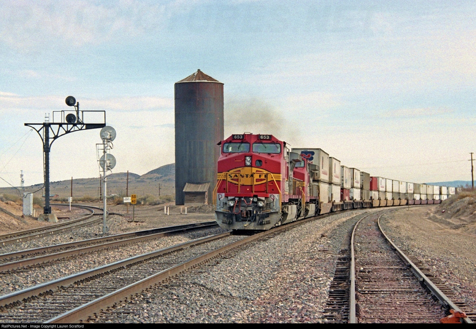 ATSF 653 W/B Intermodal at Dalies, NM on January 20, 1996, with a second unidentified ATSF Dash 9. The ATSF 653 is running on the south track of the double track at Dalies on the Gallup Subdivision. The Dalies water tank is in the background with the Glorieta Sub to Albuquerque on the far left.