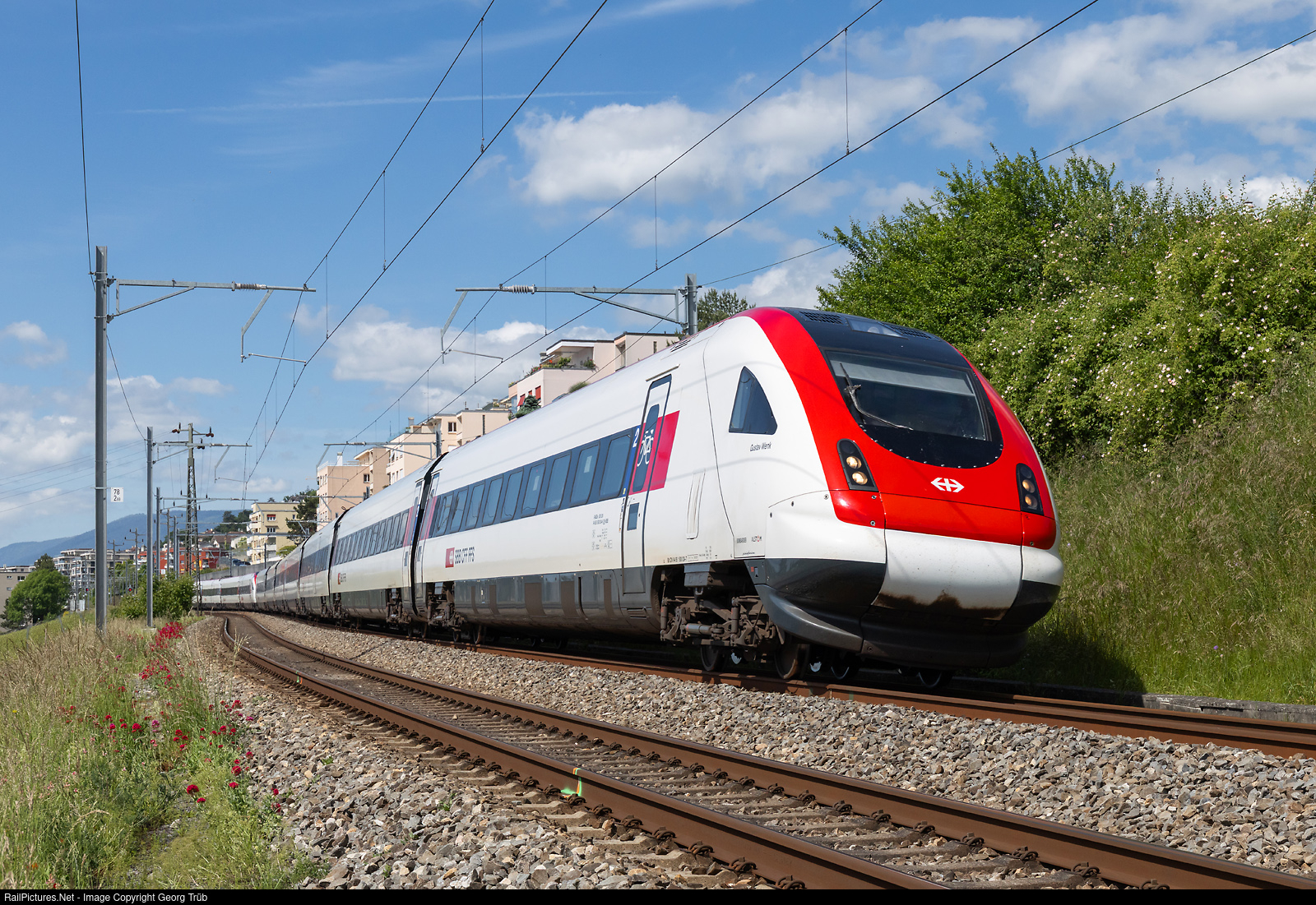 | Intercity tilting train "ICN" RABDe 500 # 034, with another of the same series in multiple control, is runing the IC 1519 of the line IC5 from Lausanne via Yverdon-les-Bains-Neuchâtel-Biel-Solothurn-Olten to Zürich, between Neuchâtel and St-Blaise CFF. |