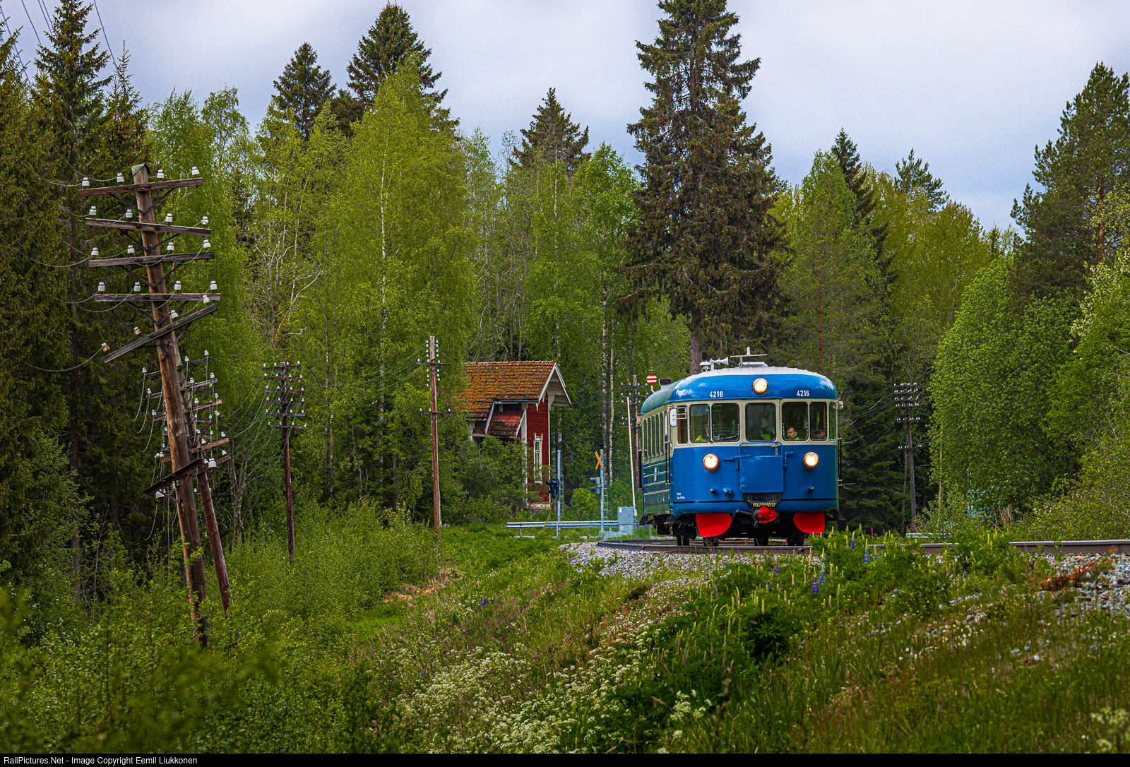 After the scheduled visit in Haapamäki by the Swedish Svenska Motorvagnsklubben, the Dm7 diesel railcar number 4216 continues its journey firts to Jyväskylä where the Swedes will have lunch and then to Mikkeli via Pieksämäki. The 4216 has left Haapamäki behind and before entering in the scenes filled with vast forrest, it curves in the scenes that are frozen in time mainly the telegraph poles and the old house in the background.