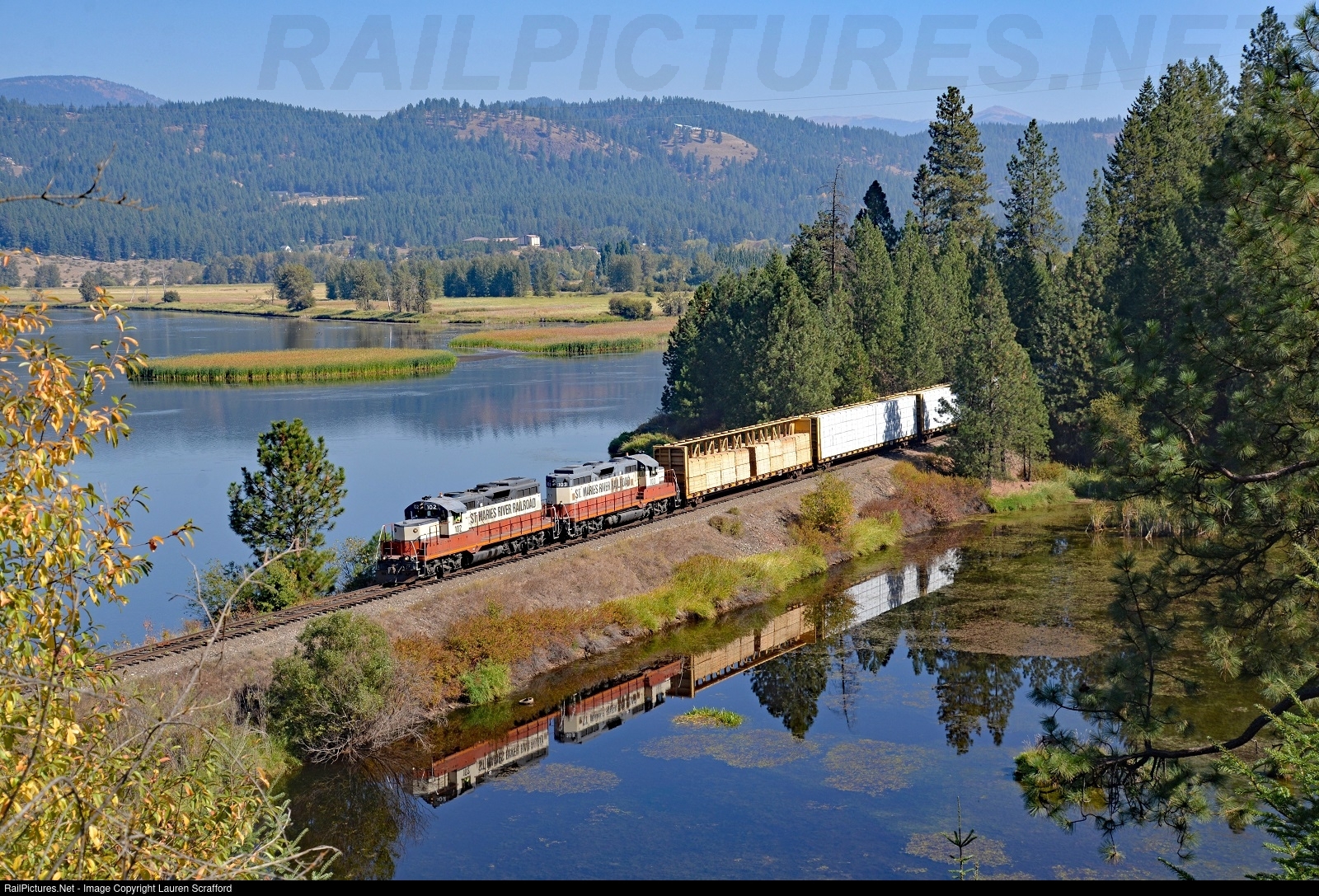 STMA 102 & 103 W/B with 15 carloads of finished lumber running on the former Milwaukee Road mainline on September 28, 2015. This train will interchange with the Union Pacific at Plummer Jct. Both units are rebuilt GP9 that were built for the Milwaukee Road in 1959 as the Milw 301 & 322.
