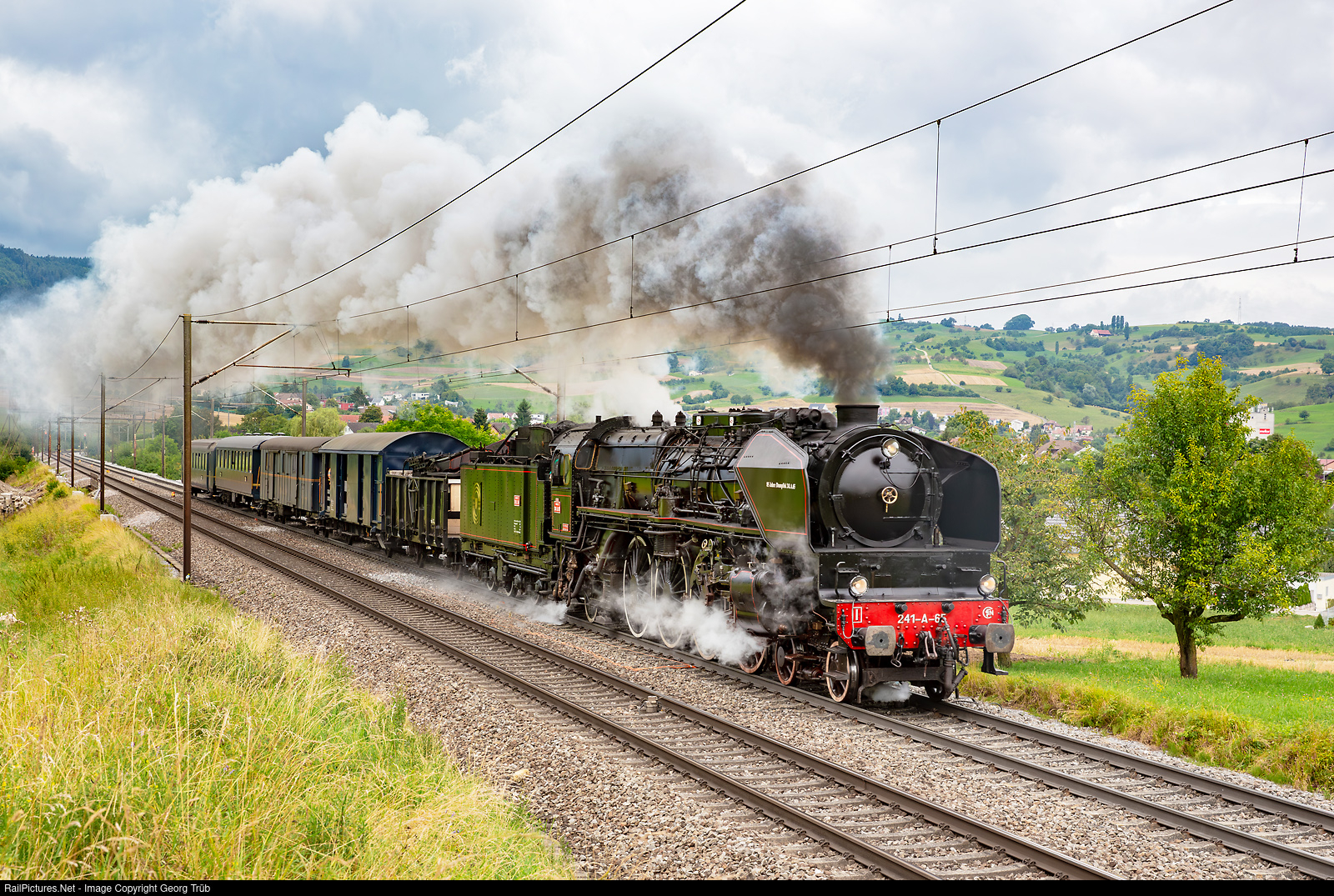| Former french railways SNCF express train steamlocomotive 241 A # 65 (former ETAT 241 001), a four cylinder compound (de Glehn design) built in 1931 by Fives/Lille for the "Chemin de fer de l'ETAT", is coal fired (with stoker) and has about 3500 HP, max. velocity is 110 km/h. Driving wheel diameter 1950 mm or 6.4 ft, weight in working order with tender 200 ton. The locomotive is operational for association "Dampflokdepot Full" (DDF) and based in Full/Argovie. It is storming up the Bözberg ramp (grade of 1.4 %) with a train to the Lyss steam days. |