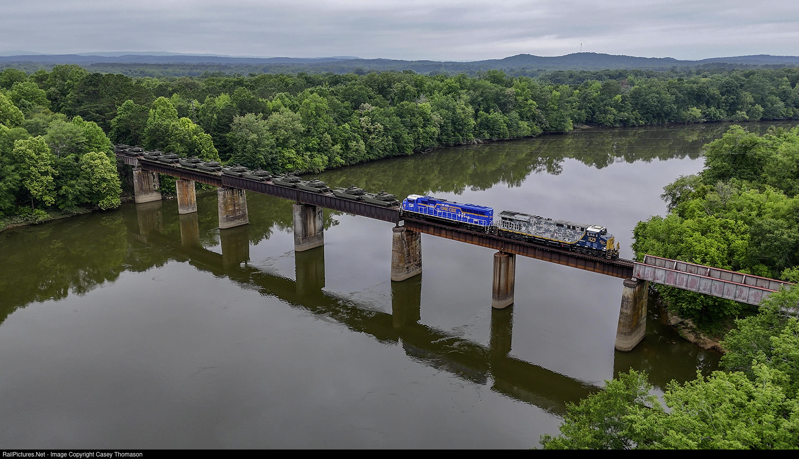CSX train S55404 crosses the Coosa River, nearing the north end of Coosa Pines, with a train load of military vehicles bound for the upcoming parade in Washington, DC, celebrating the 250th anniversary of the US Army. Appropriately, CSX's "Veterans" unit leads the train, followed by their "OneCSX" employee unit.