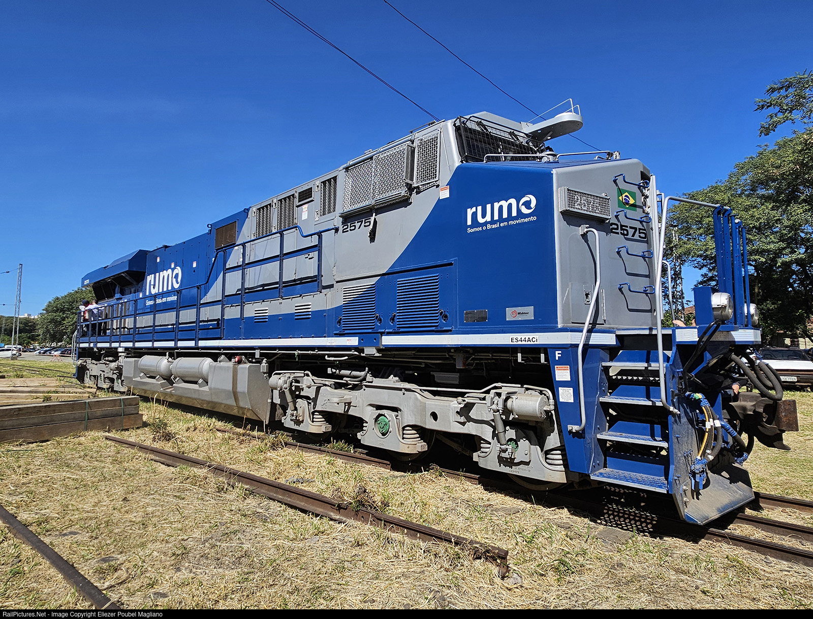 WABTEC diesel electric, Evolution Series ES44ACi, Rumo Logistica #2575 in display at the 2025 Model Railroading Meeting at Campinas, Sao Paulo, Brazil on May 17th 2025. Made in Brazil by Wabtec Corporation, fabrication date Febr. 2025, serial No. CT250201007