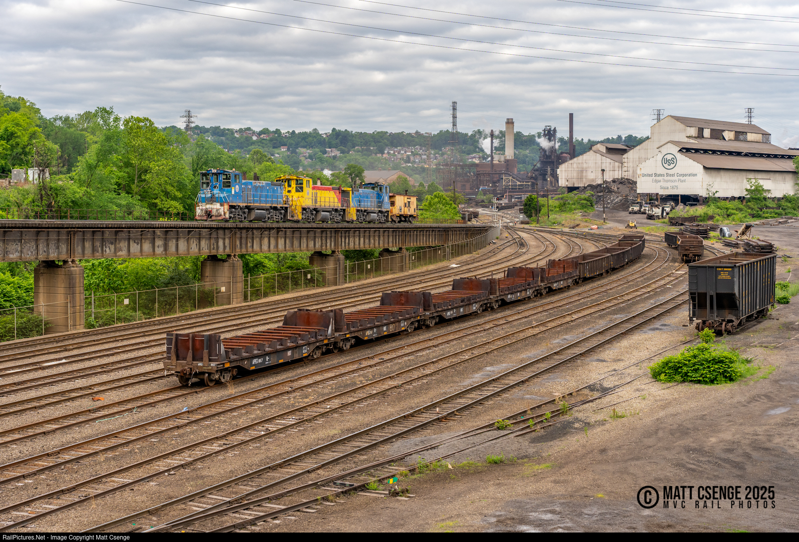 Union Railroad (URR) MP15DC no.s 11, 14, and 22 are seen with caboose 104 in tow, plodding up the ramp from the yard at US Steel Co.'s Edgar Thompson Works in East Pittsburgh, PA.