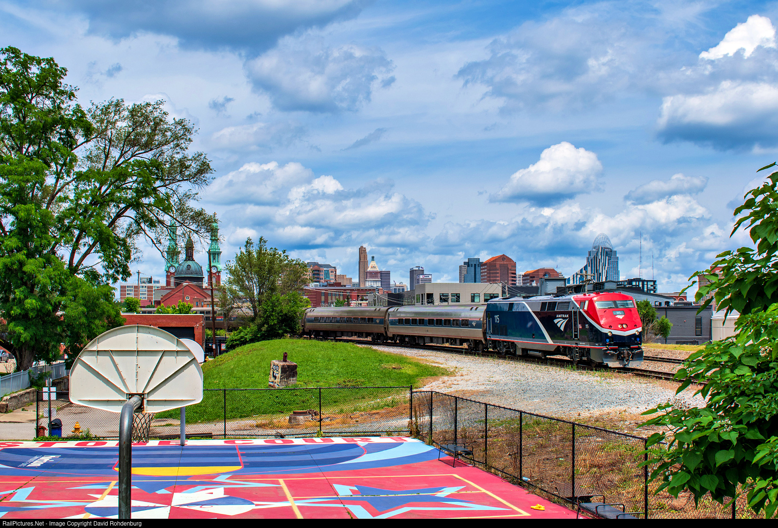 Running several hours late due to a CSX derailment that had blocked their route north of Cincinnati, Amtrak train P050-05, The Cardinal, rolls through Covington, Kentucky, passing the backdrop of the Mother of God Catholic Church and the skyline of Cincinnati, as viewed from Annie Hargraves Park.