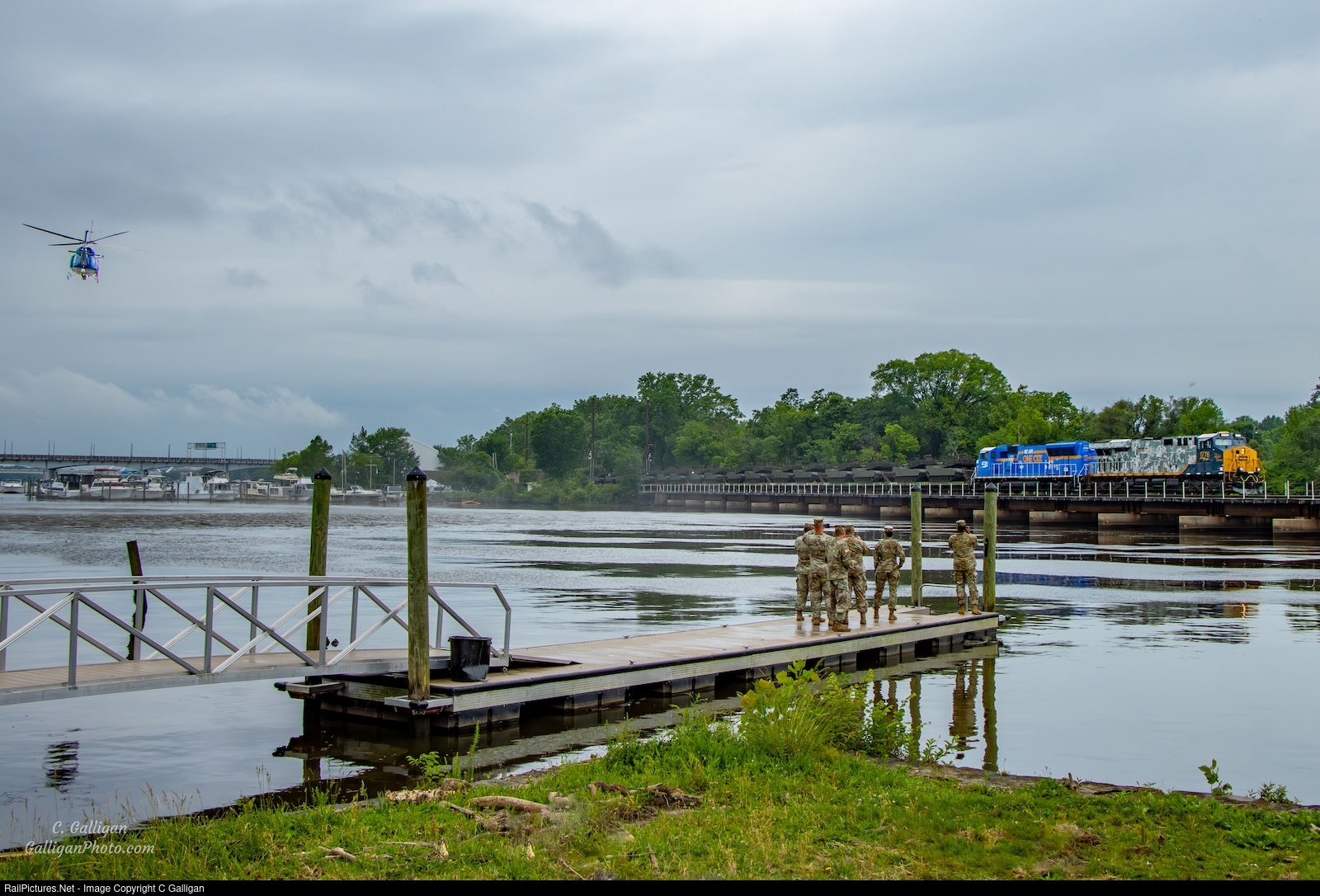 | CSX Military Train S554 crosses over the Anacostia River with CSXT 1776 "Spirit of our Armed Forces" and CSXT 4720 "One CSX". Behind the commemorative power is fifty cars of military equipment that will be used in a special parade recognizing the 250th anniversary of the Army. A crowd gathered by both land and air to watch the sight, with National Park Police Helicopter N412PP kicking the water up. |