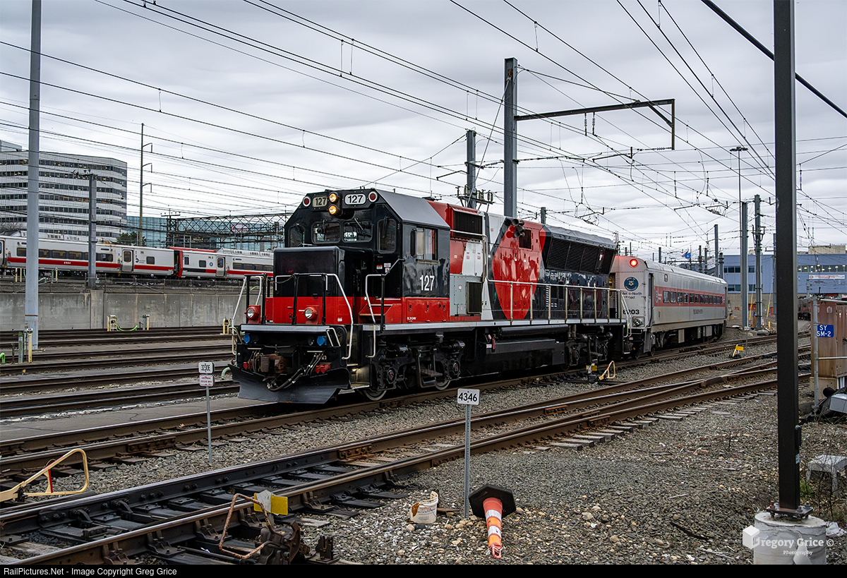 On April 11th, 2025, Metro-North Railroad's Stamford Switcher, with CTDOT/CTrail Brookville BL20GHM #127, tows disabled Danbury Train 1838 into the the "lower level" of Stamford Yard in Stamford, Connecticut. Train 1838, featuring an all-CTDOT Mini-Bomb consist, suffered a ground fault issue on its locomotive, CTDOT/CTrail EMD GP40-3H #6699 at Noroton Heights. The disabled train was towed back to Stamford Yard.
