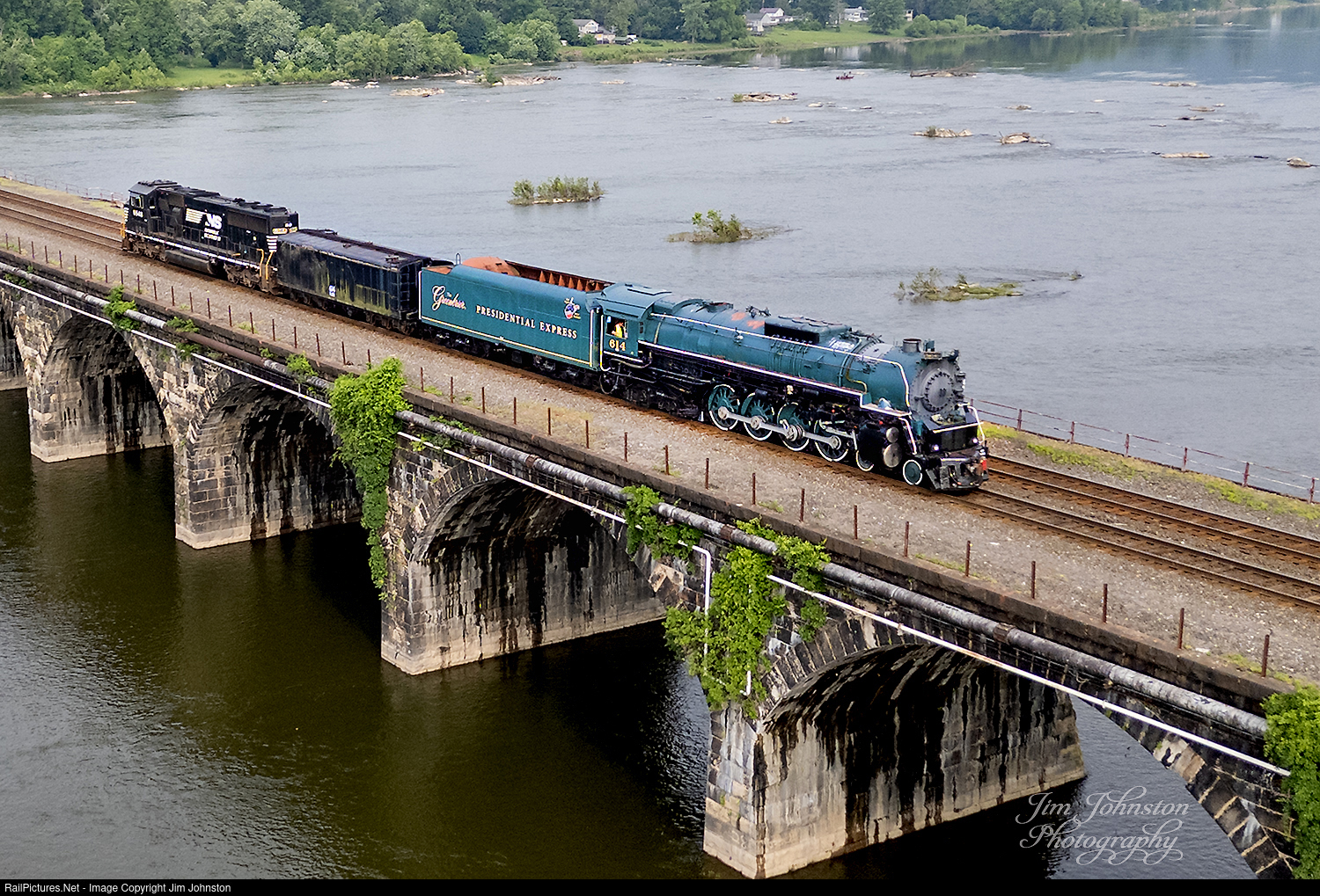 C&O 614 4-8-4 Steam Engine on NS 068 with NS 6948 leading the move over the Susquehanna River on the famed Rockville Bridge. The locomotive will undergo extensive renovation at the Strasburg Railroad shops.