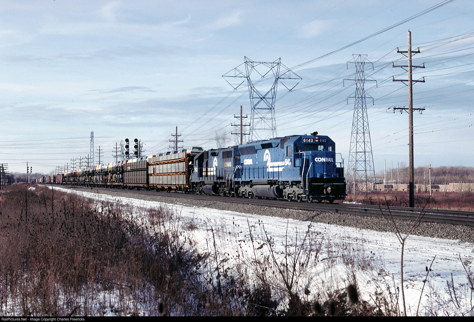 Conrail COSY9, Columbus to Syracuse, approaches the old Reynolds Road grade crossing in Mentor, Ohio, on December 29, 1978. Power is a Conrail blue SD45 and GP38, both of Penn Central heritage. First autorack behind them appears to have a Dodge Diplomat up front, so likely coming from Fenton, near St. Louis.