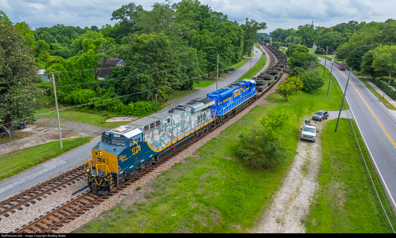 | With 51 loads of Tanks and other Military equipment, CSX Military Train S554-04 is seen here heading Northbound through Palmetto, GA. with none other than CSX's Veterans Locomotive #1776 leading the "We Are ONE CSX" #4720 in the trailing position. This Train is bound for Washington, DC for a special Military Parade on June 14th to celebrate the 250th anniversary of the US Army. |