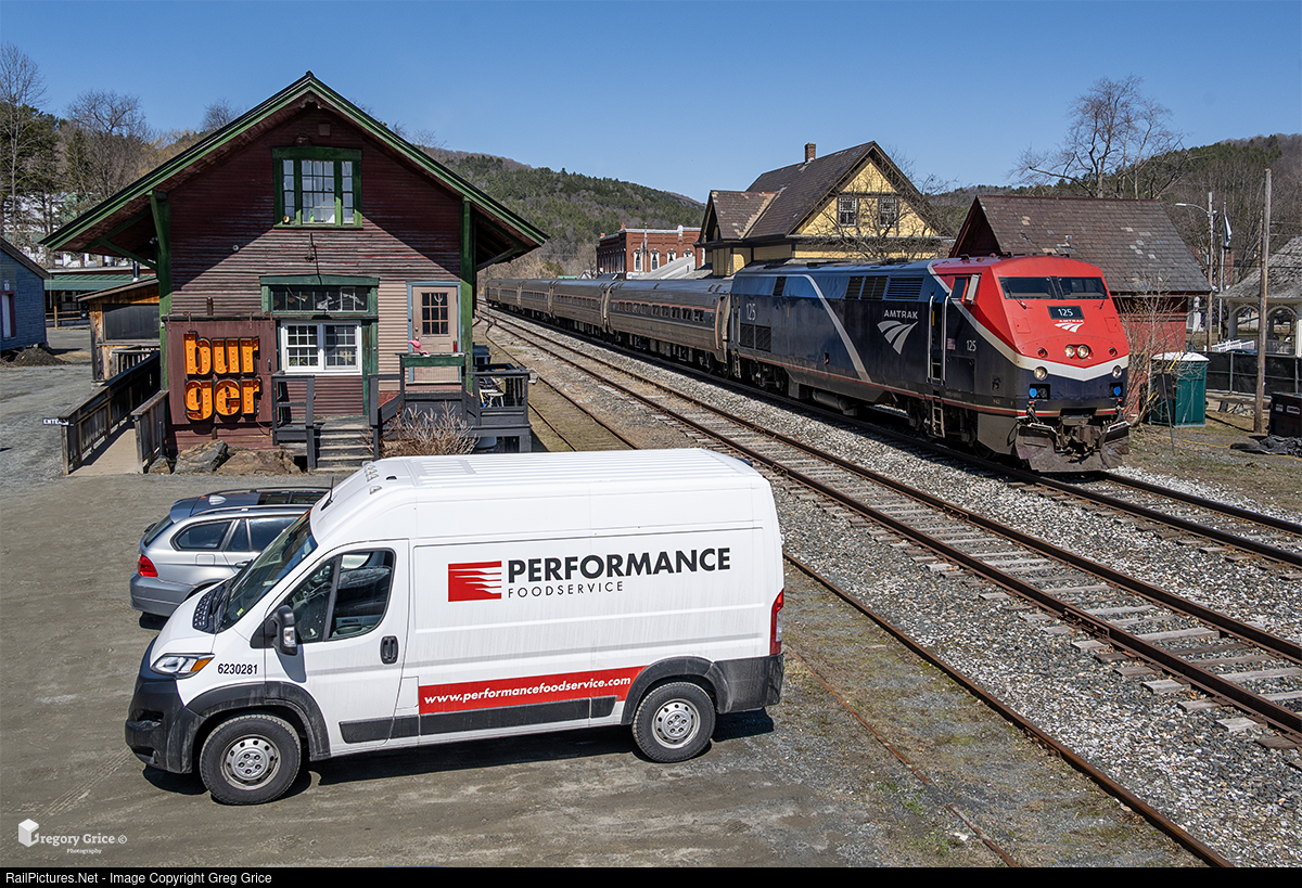 On the morning of April 14, 2025, Amtrak P42DC #125, painted in Phase VII, leads southbound Vermonter Train 57 past the former South Royalton freight depot, now home to the popular Worthy Burger restaurant, in South Royalton, Vermont, on the New England Central Railroad’s Roxbury Subdivision.